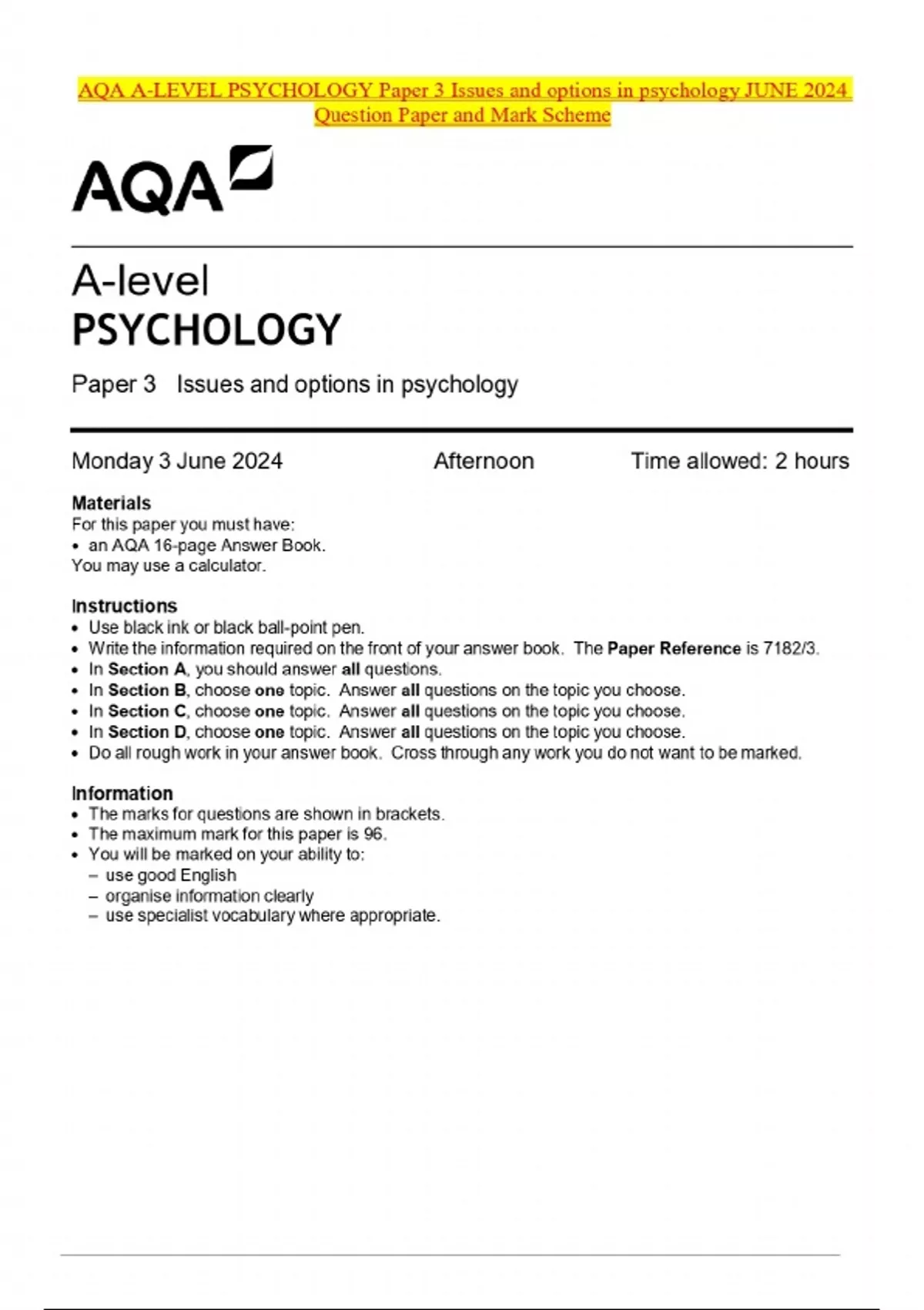 AQA A-LEVEL PSYCHOLOGY Paper 3 Issues and options in psychology JUNE 2024 Question Paper and Mark Scheme