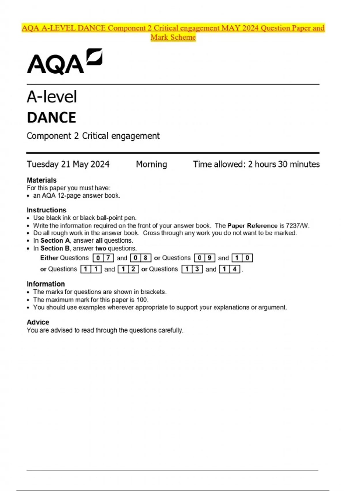 AQA A-LEVEL DANCE Component 2 Critical engagement MAY 2024 Question Paper and Mark Scheme