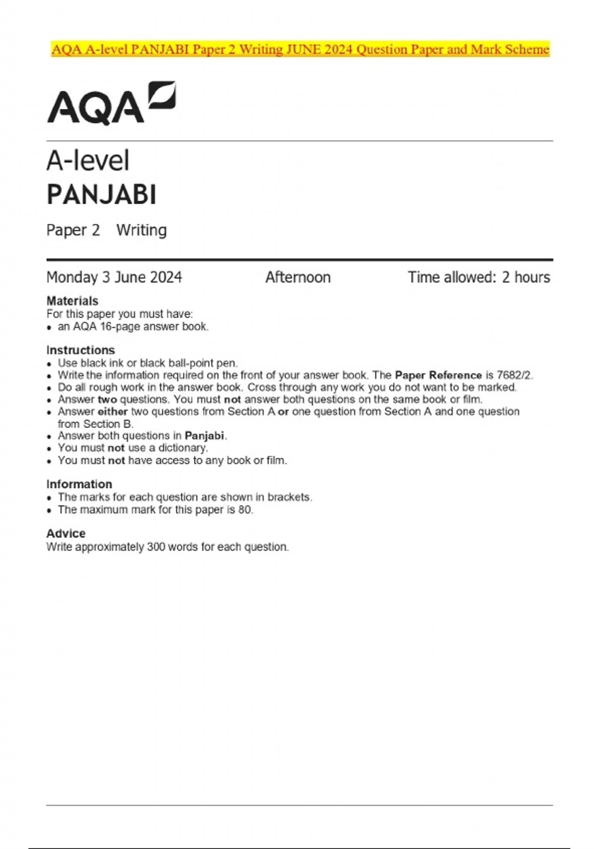 AQA A-level PANJABI Paper 2 Writing JUNE 2024 Question Paper and Mark Scheme