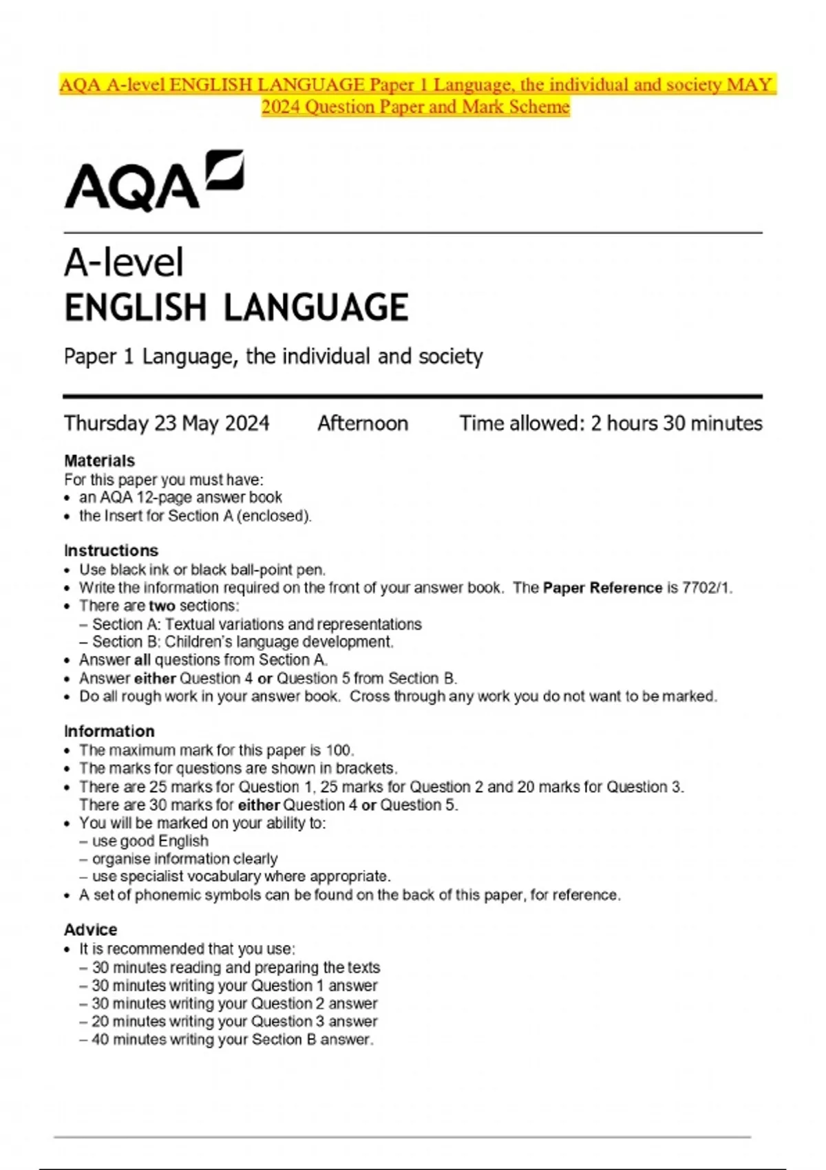 AQA A-level ENGLISH LANGUAGE Paper 1 Language, the individual and society MAY 2024 Question Paper and Mark Scheme