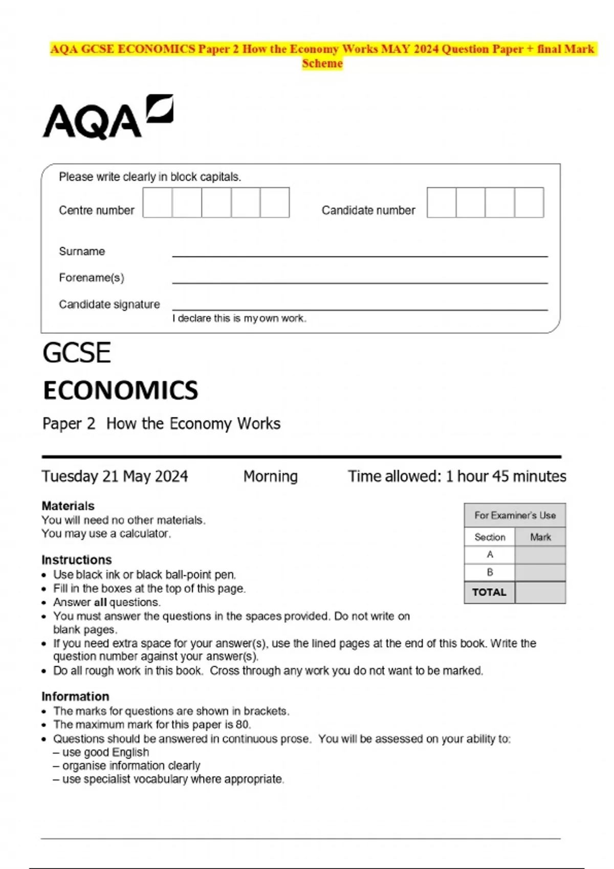 AQA GCSE ECONOMICS Paper 2 How the Economy Works MAY 2024 Question Paper + final Mark Scheme