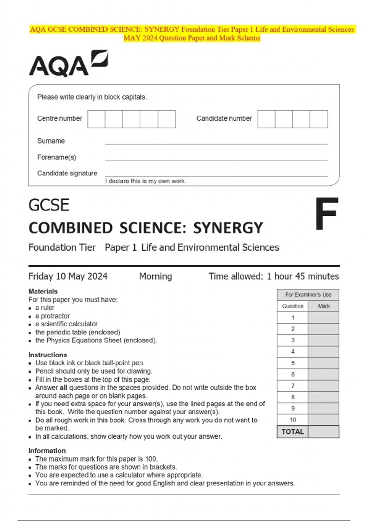 AQA GCSE COMBINED SCIENCE: SYNERGY Foundation Tier Paper 1 Life and Environmental Sciences MAY 2024 Question Paper and Mark Scheme