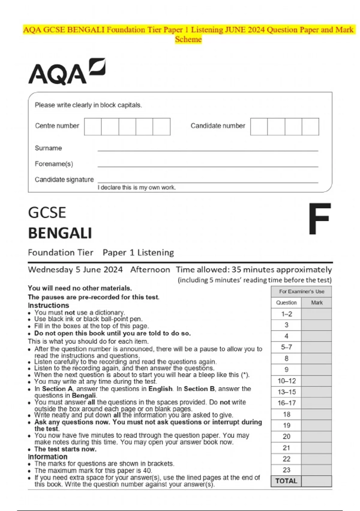 AQA GCSE BENGALI Foundation Tier Paper 1 Listening JUNE 2024 Question Paper and Mark Scheme