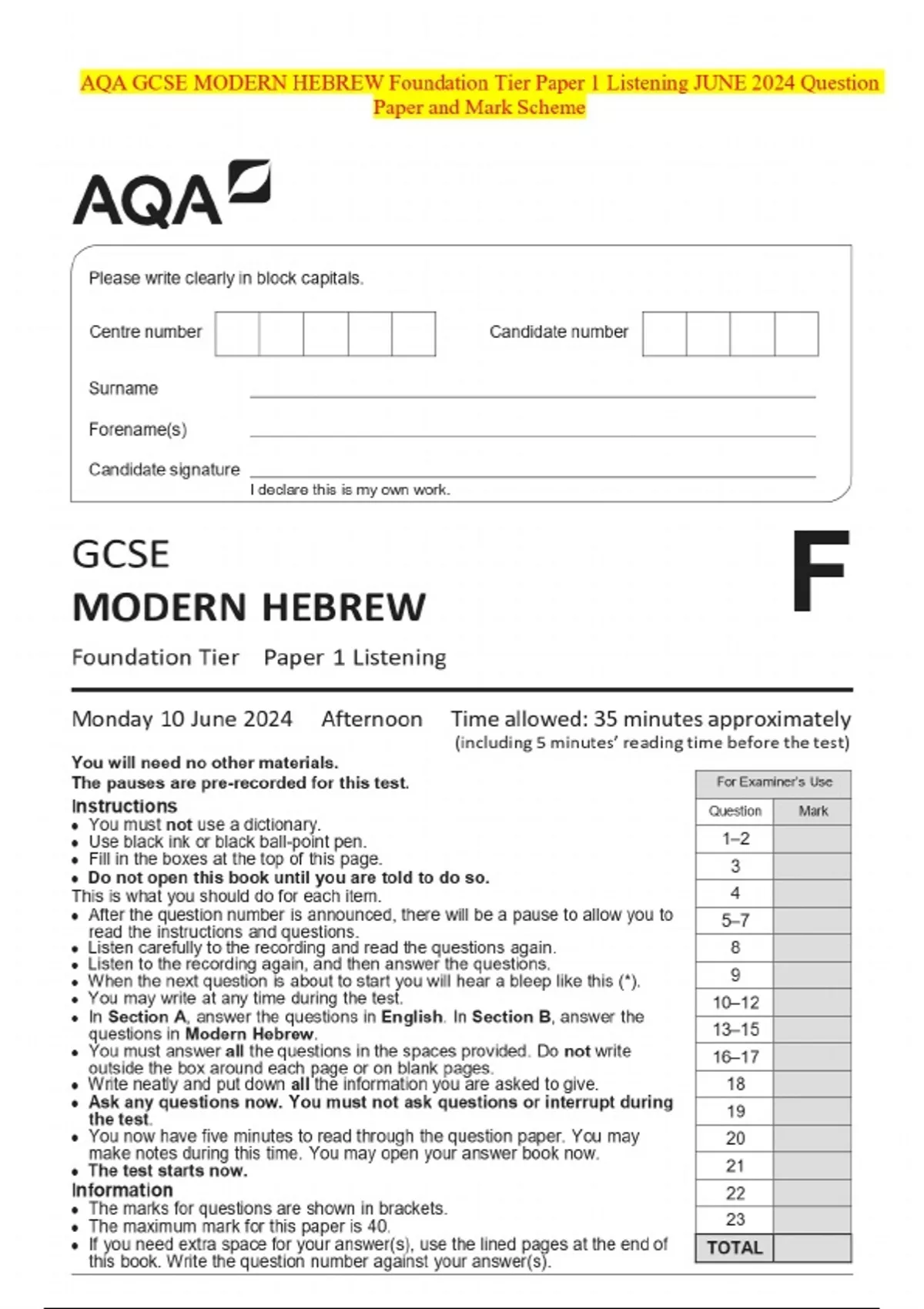 AQA GCSE MODERN HEBREW Foundation Tier Paper 1 Listening JUNE 2024 Question Paper and Mark Scheme