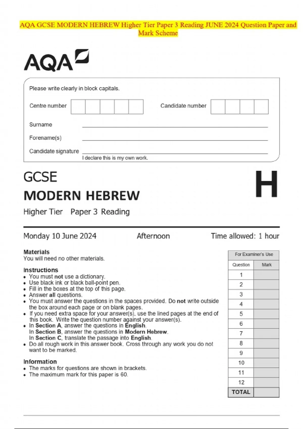 AQA GCSE MODERN HEBREW Higher Tier Paper 3 Reading JUNE 2024 Question Paper and Mark Scheme