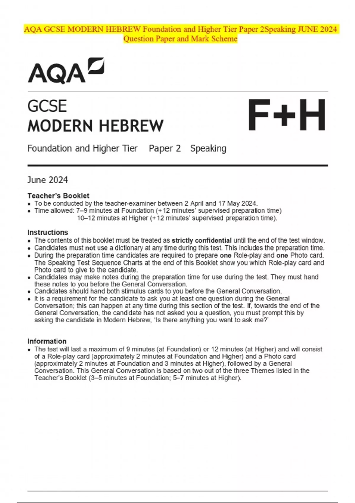 AQA GCSE MODERN HEBREW Foundation and Higher Tier Paper 2Speaking JUNE 2024 Question Paper and Mark Scheme
