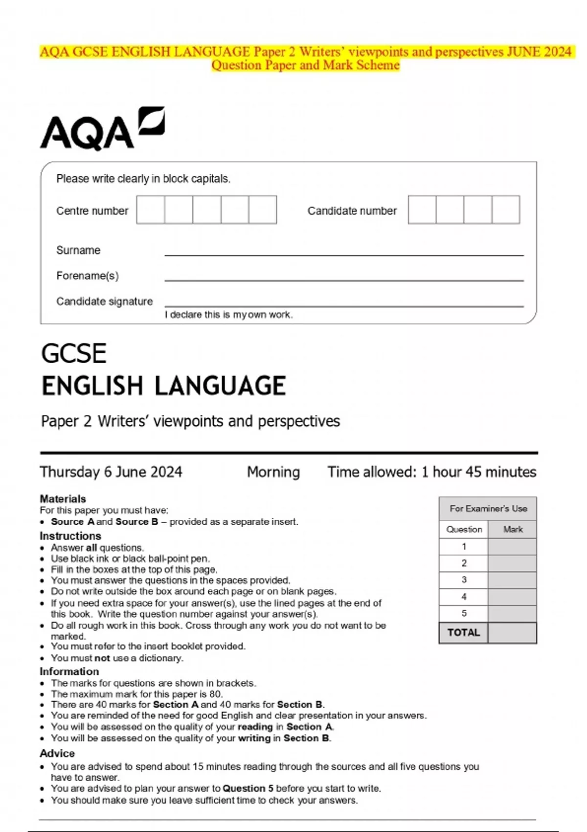 AQA GCSE ENGLISH LANGUAGE Paper 2 Writers’ viewpoints and perspectives JUNE 2024 Question Paper and Mark Scheme