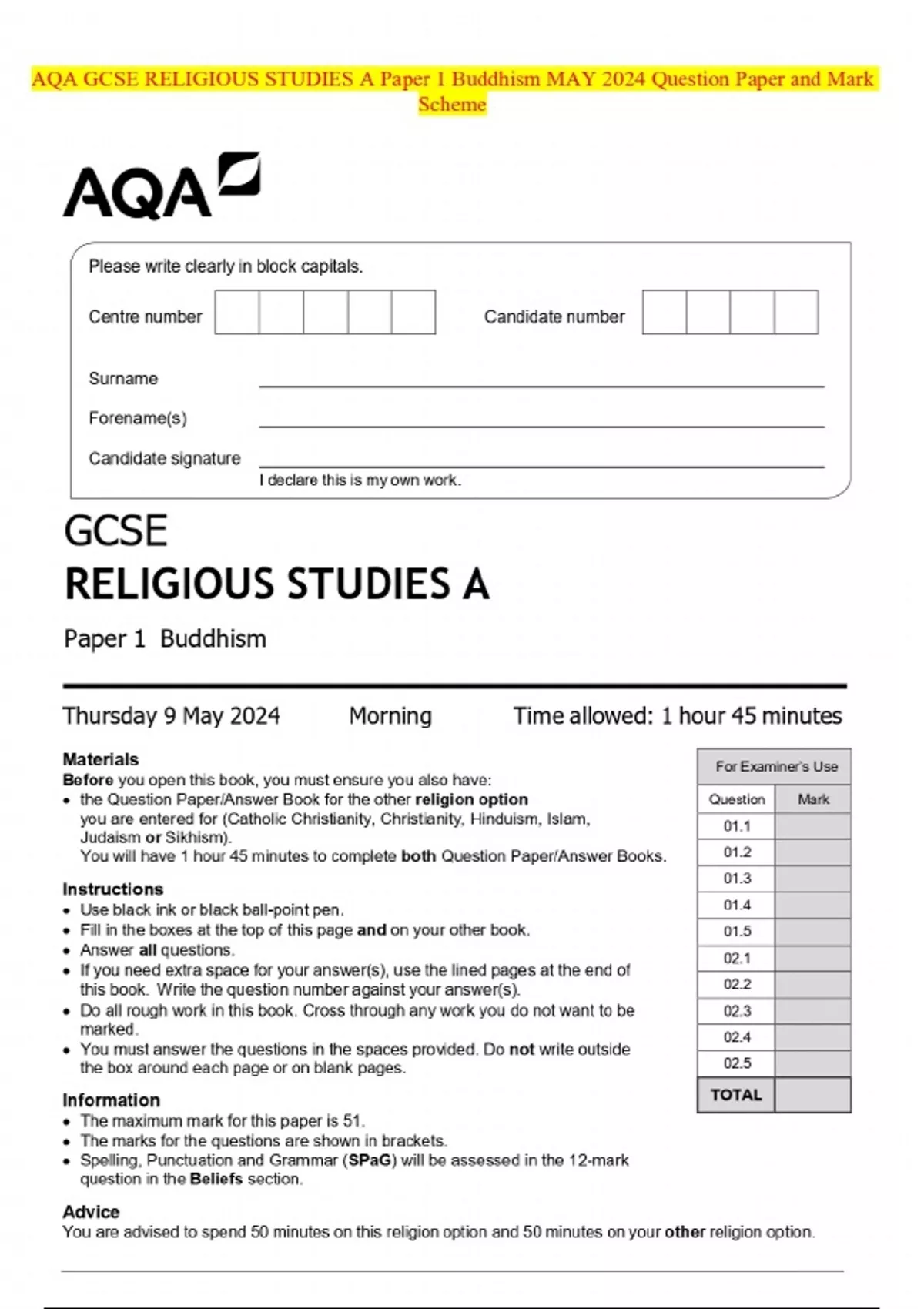 AQA GCSE RELIGIOUS STUDIES A Paper 1 Buddhism MAY 2024 Question Paper and Mark Scheme