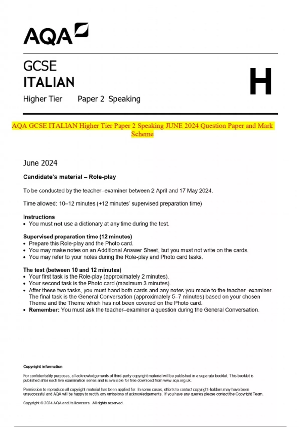 AQA GCSE ITALIAN Higher Tier Paper 2 Speaking JUNE 2024 Question Paper and Mark Scheme