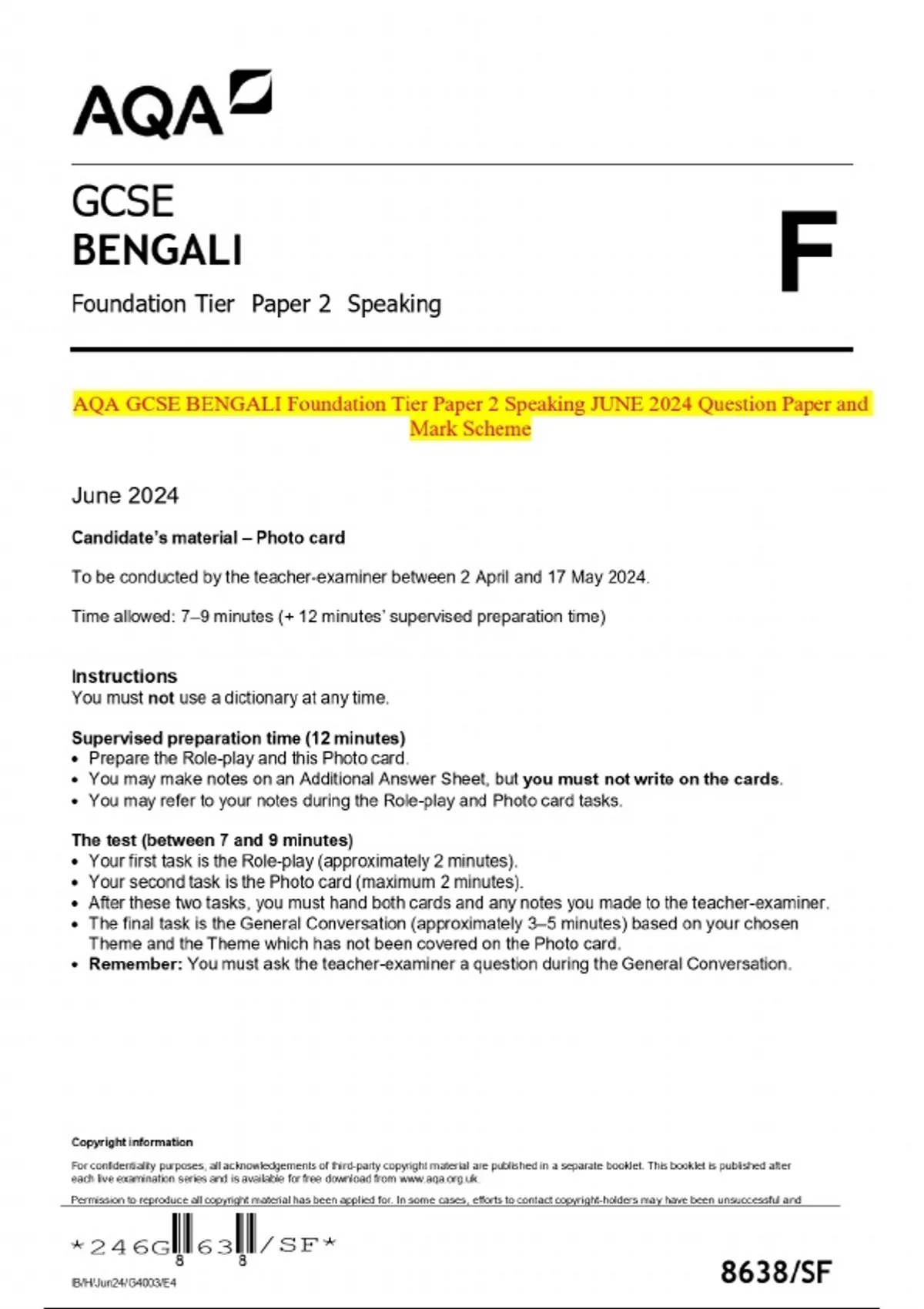 AQA GCSE BENGALI Foundation Tier Paper 2 Speaking JUNE 2024 Question Paper and Mark Scheme