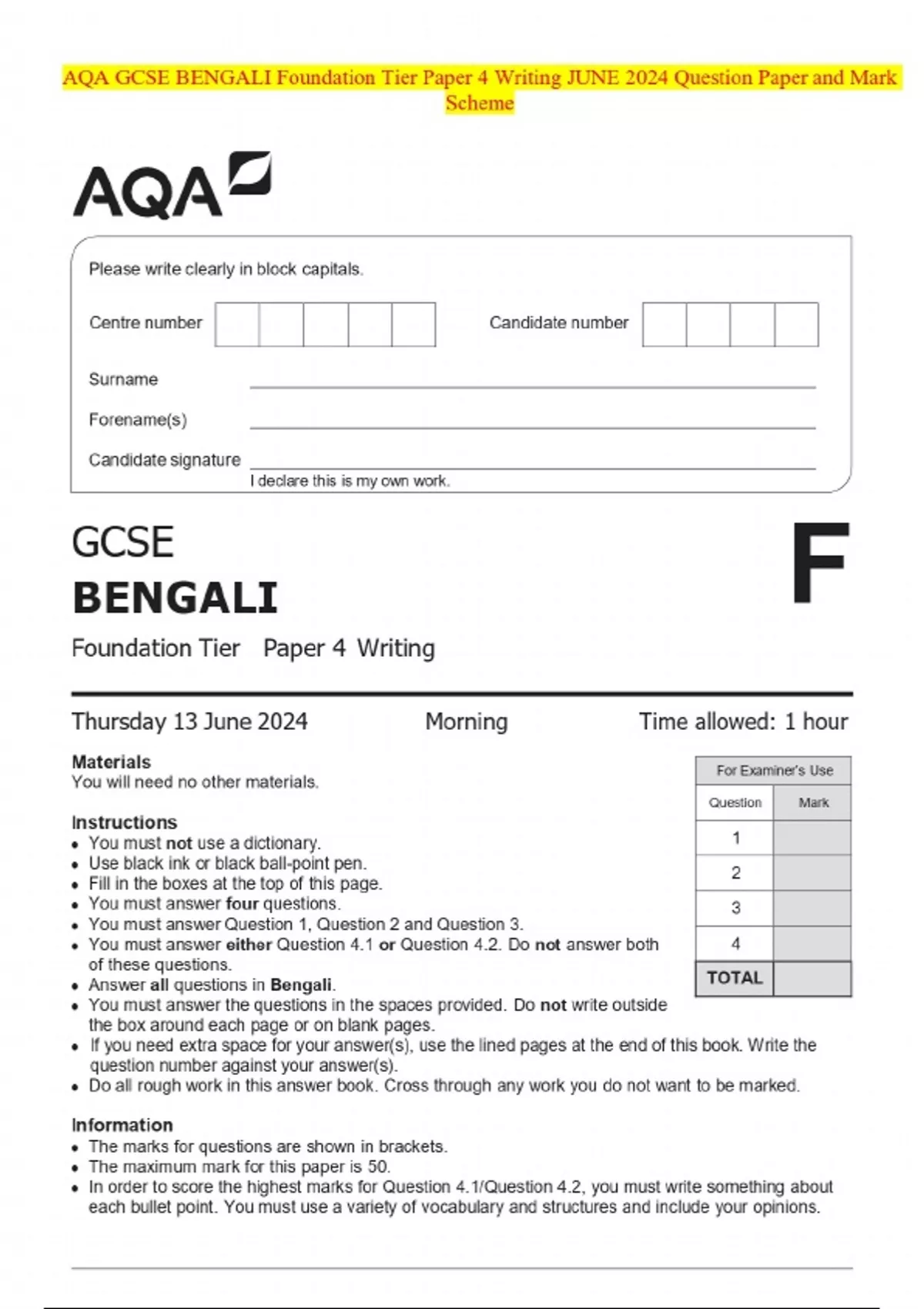 AQA GCSE BENGALI Foundation Tier Paper 4 Writing JUNE 2024 Question Paper and Mark Scheme