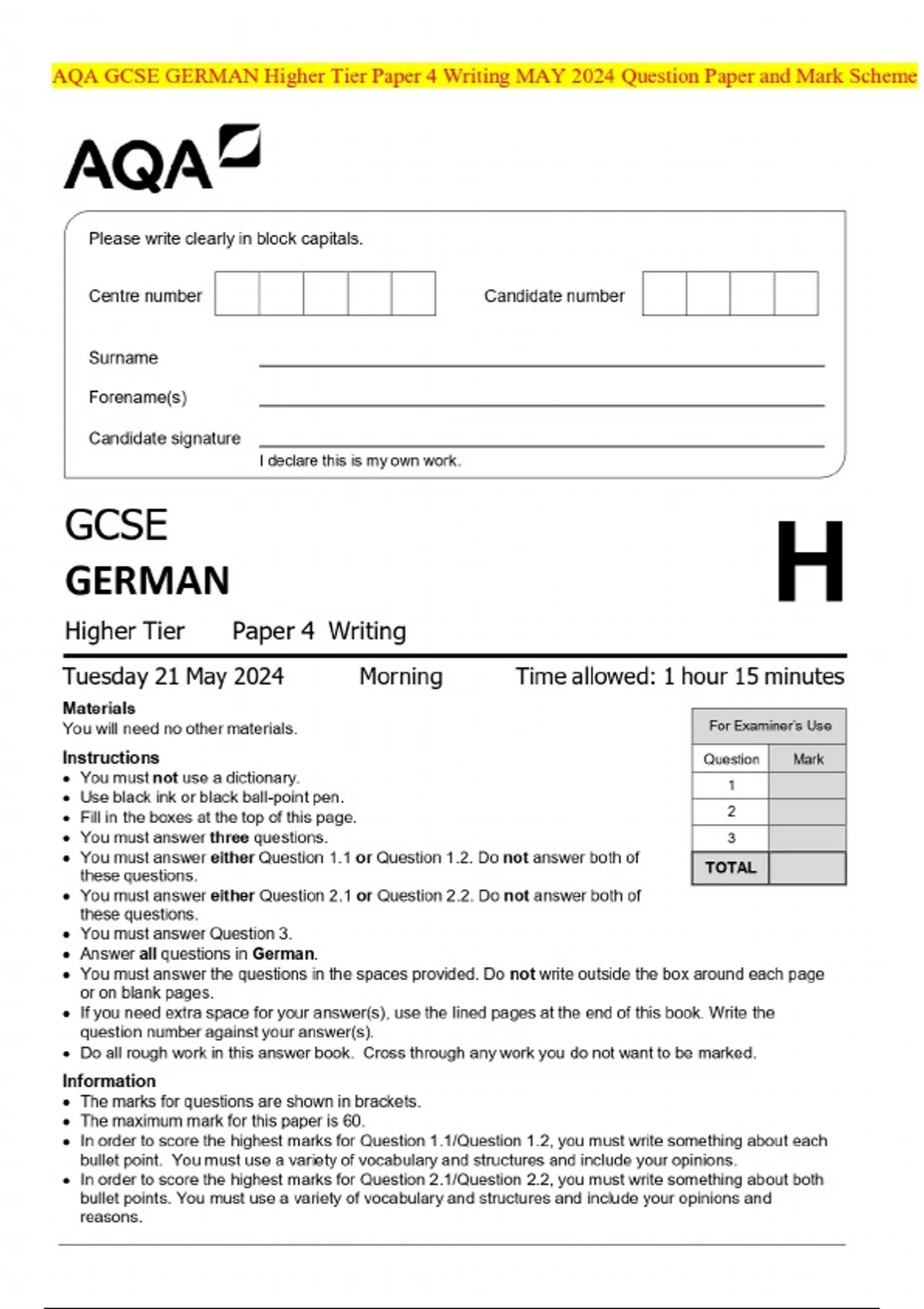 AQA GCSE GERMAN Higher Tier Paper 4 Writing MAY 2024 Question Paper and Mark Scheme