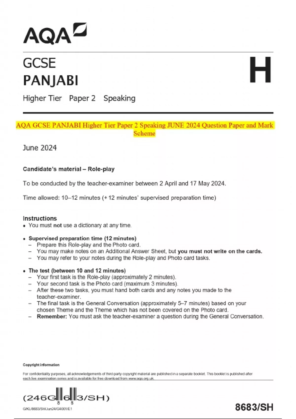 AQA GCSE PANJABI Higher Tier Paper 2 Speaking JUNE 2024 Question Paper and Mark Scheme