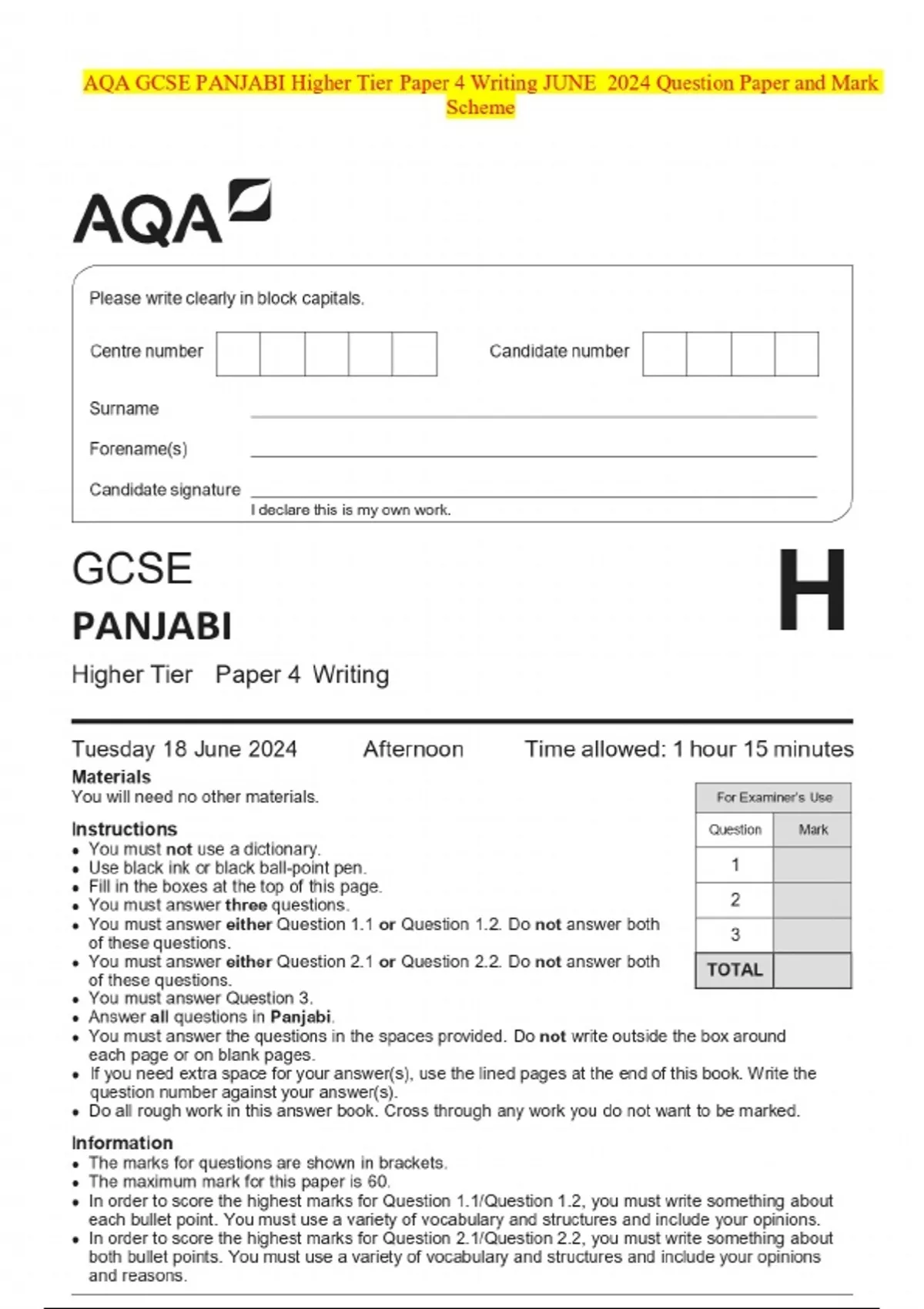 BUNDLED AQA GCSE PANJABI Higher Tier Paper 1 2 3 & 4 JUNE 2024 Question Paper and Mark Scheme