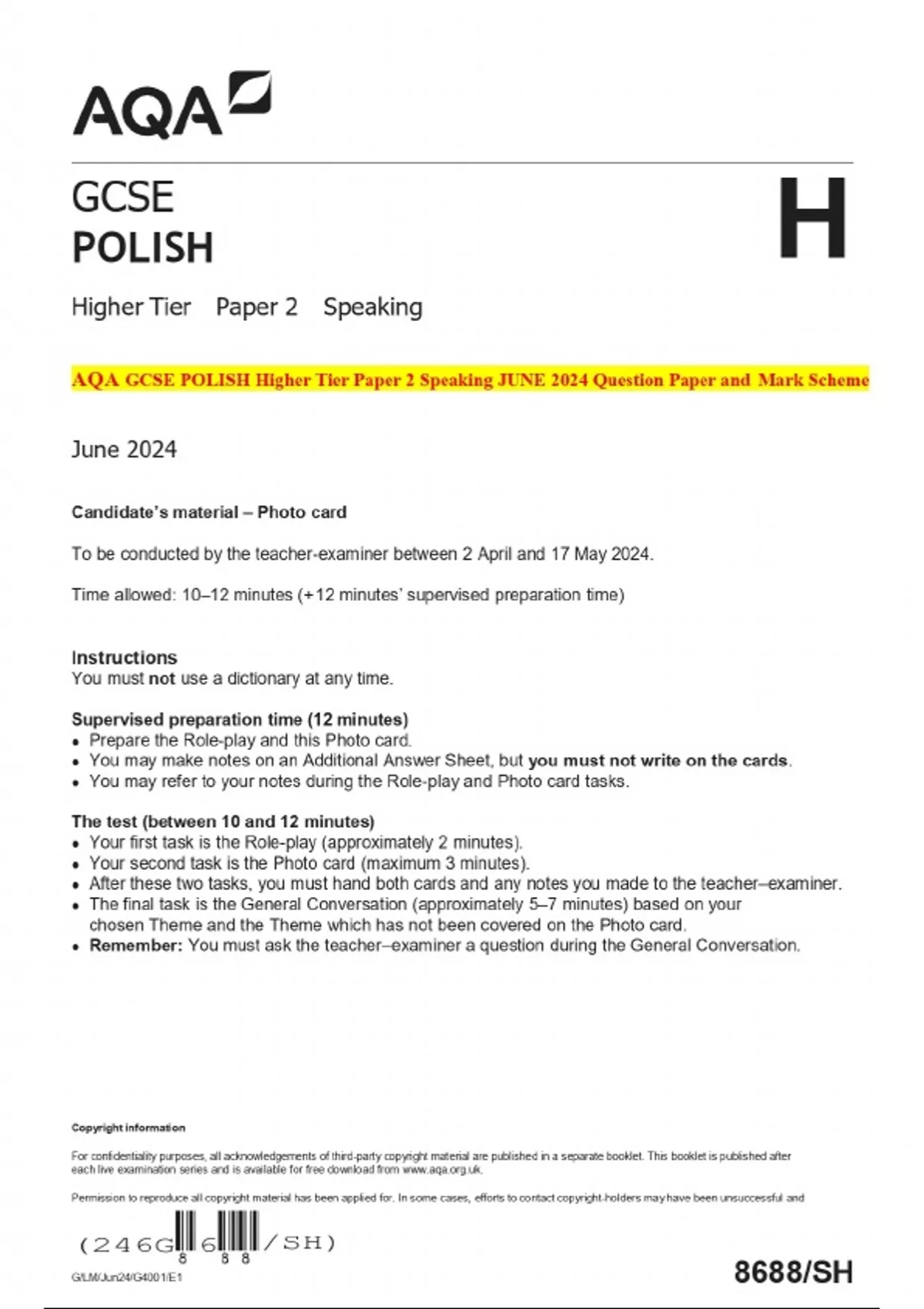 AQA GCSE POLISH Higher Tier Paper 2 Speaking JUNE 2024 Question Paper and Mark Scheme