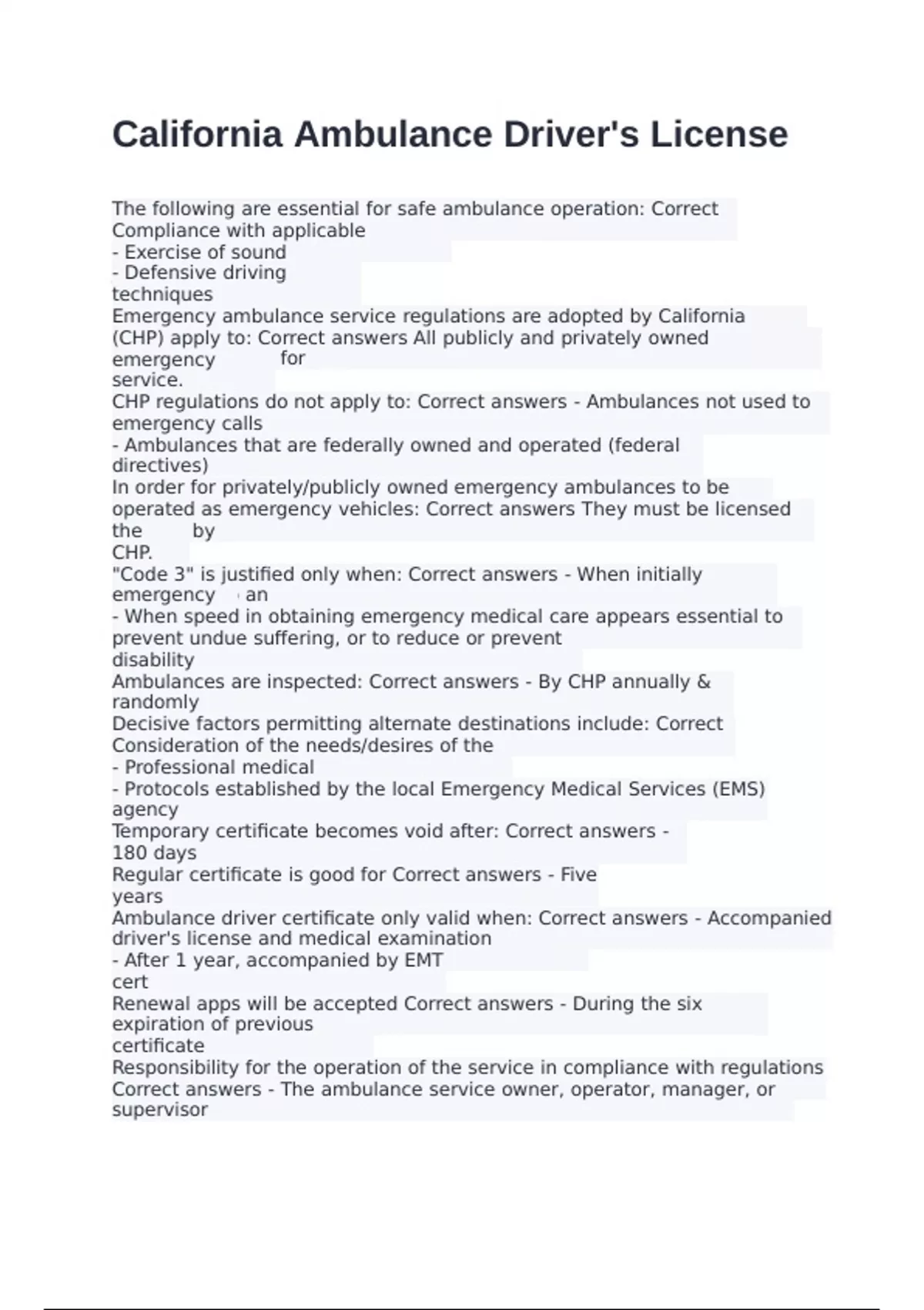 The following are essential for safe ambulance operation: Correct answers - Compliance with applicable requirements - Exercise of sound judgment - Defensive driving techniques Emergency ambulance service regulations are adopted by California Highway Patrol (CHP) apply to: Correct answers All publicly and privately owned ambulances used for emergency service. CHP regulations do not apply to: Correct answers - Ambulances not used to respond to emergency calls (IFT) - Ambulances that are federally owned and operated (federal directives) In order for privately/publicly owned emergency ambulances to be equipped and operated as emergency vehicles: Correct answers They must be licensed to do so by the CHP. "Code 3" is justified only when: Correct answers - When initially responding to an emergency call - When speed in obtaining emergency medical care appears essential to save a life, prevent undue suffering, or to reduce or prevent disability Ambulances are inspected: Correct answers - By CHP annually & randomly Decisive factors permitting alternate destinations include: Correct answers - Consideration of the needs/desires of the patient - Professional medical direction - Protocols established by the local Emergency Medical Services (EMS) agency Temporary certificate becomes void after: Correct answers - 180 days Regular certificate is good for Correct answers - Five years Ambulance driver certificate only valid when: Correct answers - Accompanied by a valid driver's license and medical examination certificate (2 yrs) - After 1 year, accompanied by EMT cert Renewal apps will be accepted Correct answers - During the six months prior to expiration of previous certificate Responsibility for the operation of the service in compliance with regulations rests with: Correct answers - The ambulance service owner, operator, manager, or supervisor