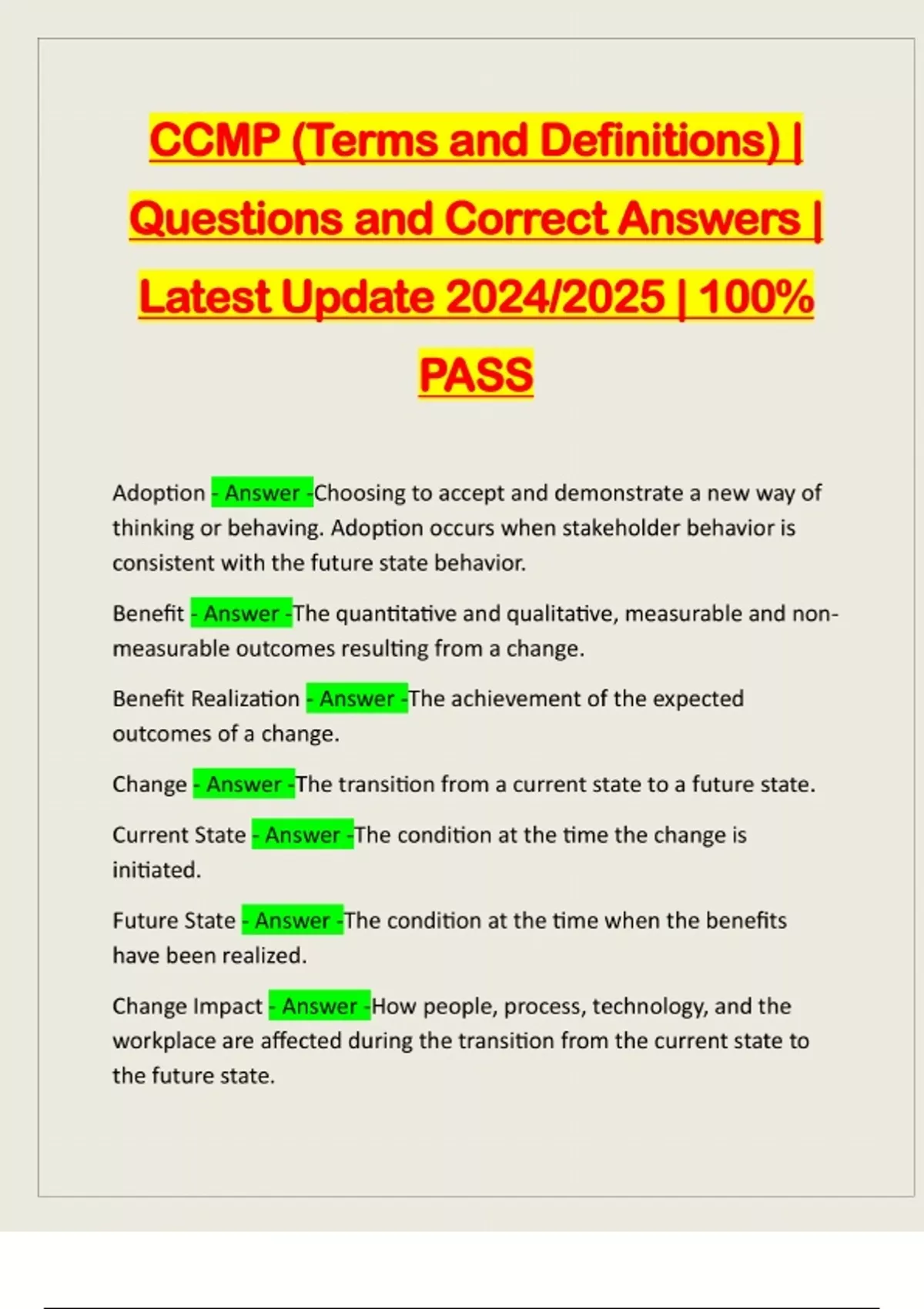 CCMP (Terms and Definitions) | Questions and Correct Answers | Latest Update 2024/2025 | 100% PASS Adoption - Answer -Choosing to accept and demonstrate a new way of thinking or behaving. Adoption occurs when stakeholder behavior is consistent with the future state behavior. Benefit - Answer -The quantitative and qualitative, measurable and nonmeasurable outcomes resulting from a change. Benefit Realization - Answer -The achievement of the expected outcomes of a change. Change - Answer -The transition from a current state