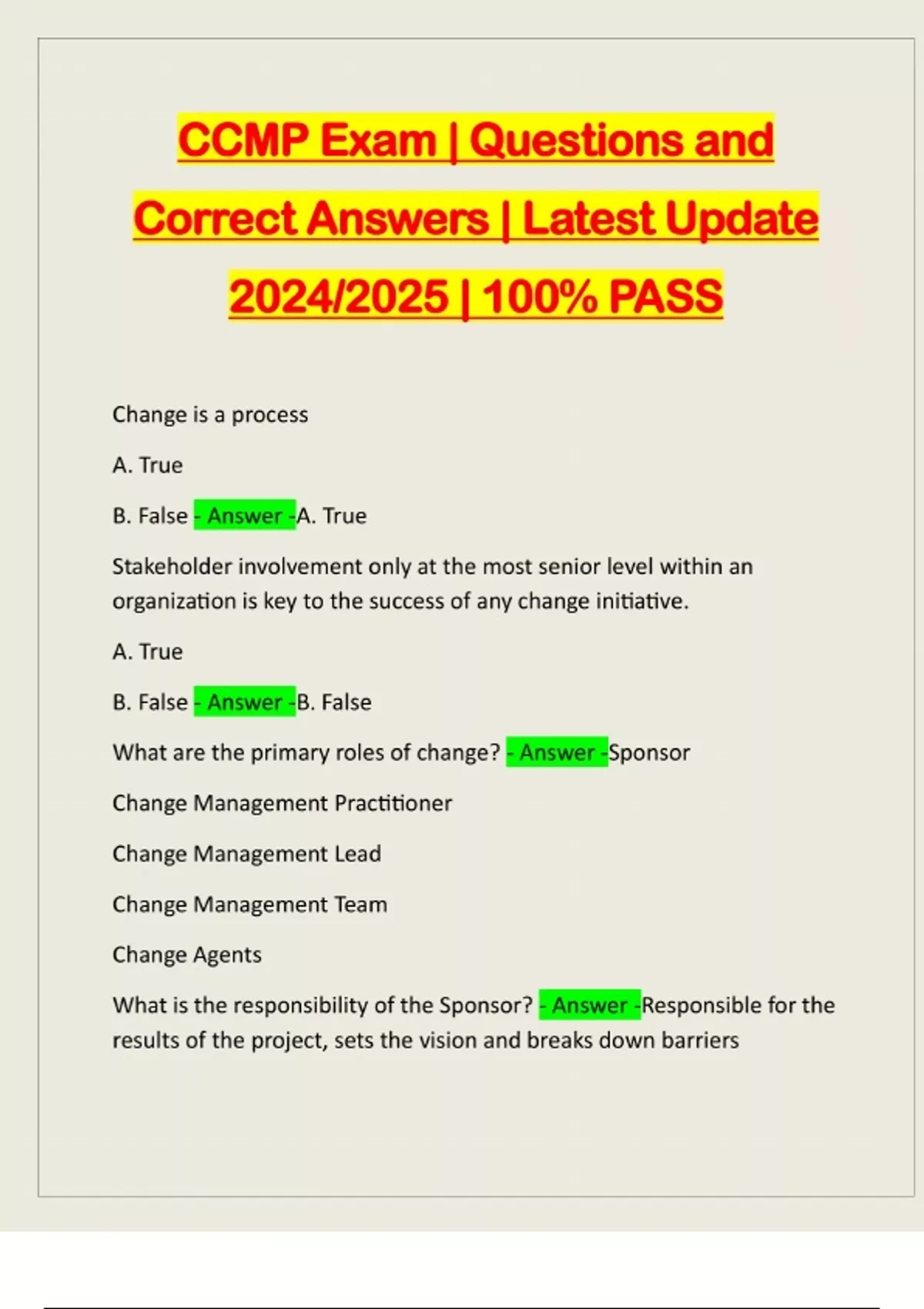 CCMP Exam | Questions and Correct Answers | Latest Update 2024/2025 | 100% PASS Change is a process A. True B. False - Answer -A. True Stakeholder involvement only at the most senior level within an organization is key to the success of any change initiative. A. True B. False - Answer -B. False What are the primary roles of change? - Answer -Sponsor Change Management Practitioner Change Management Lead Change Management Team Change Agents What is the responsibility of the Sponsor? - Answer -Responsible for the results of the project, sets the vision and breaks down barriersWhat is the responsibility of the Change Leader? - Answer -He or she is able to plan, lead and organize the change What is the responsibility of the Change Agents? - Answer -These people have creative problem-solving, interpersonal skills and communication abilities What is the responsibility of the Change Te