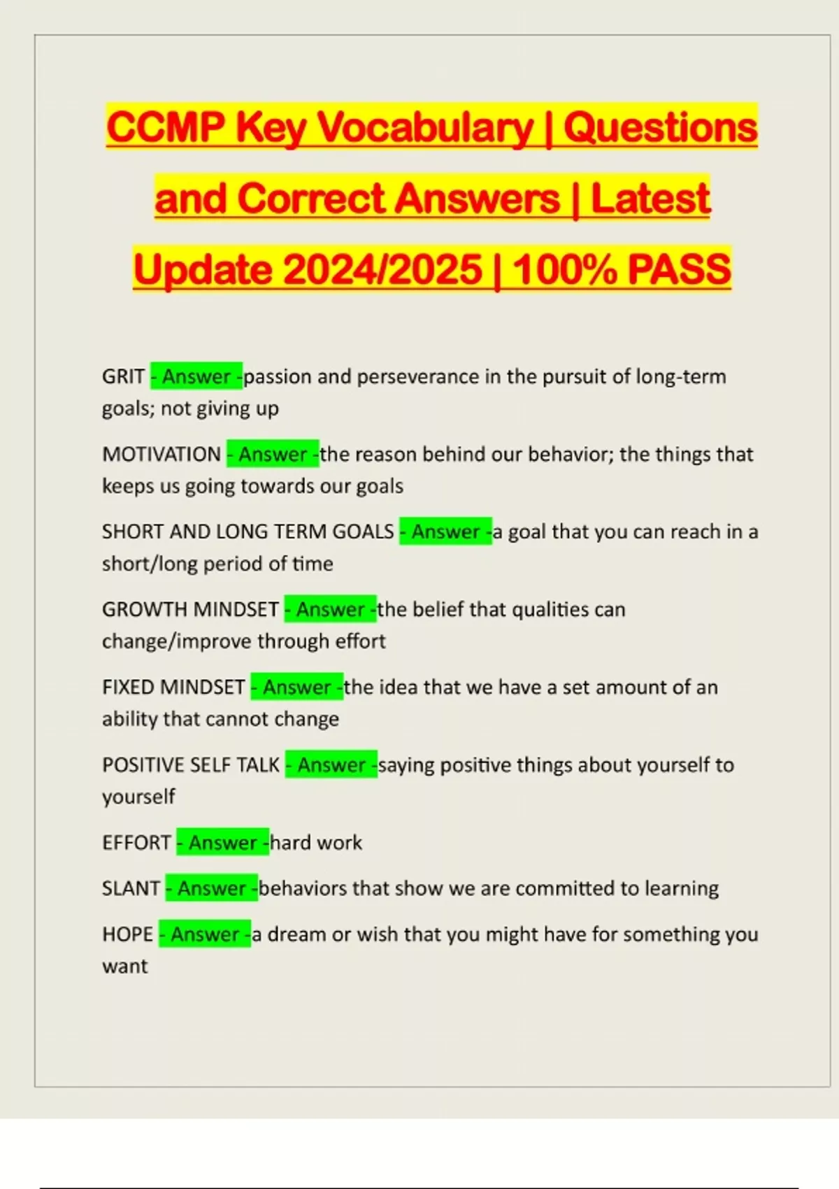 CCMP Key Vocabulary | Questions and Correct Answers | Latest Update 2024/2025 | 100% PASS GRIT - Answer -passion and perseverance in the pursuit of long-term goals; not giving up MOTIVATION - Answer -the reason behind our behavior; the things that keeps us going towards our goals SHORT AND LONG TERM GOALS - Answer -a goal that you can reach in a short/long period of time GROWTH MINDSET - Answer -the belief that qua