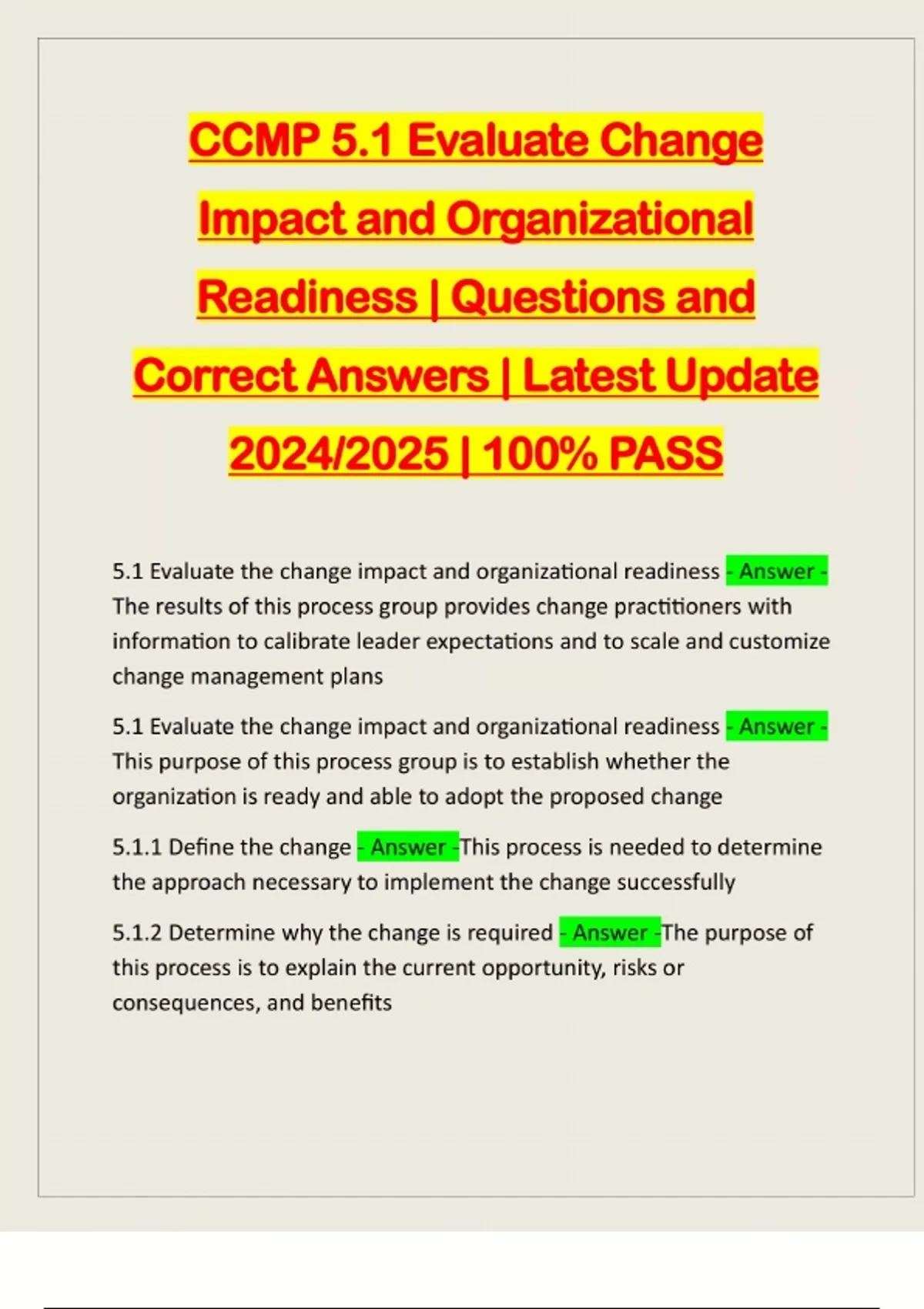 CCMP 5.1 Evaluate Change Impact and Organizational Readiness | Questions and Correct Answers | Latest Update 2024/2025 | 100% PASS