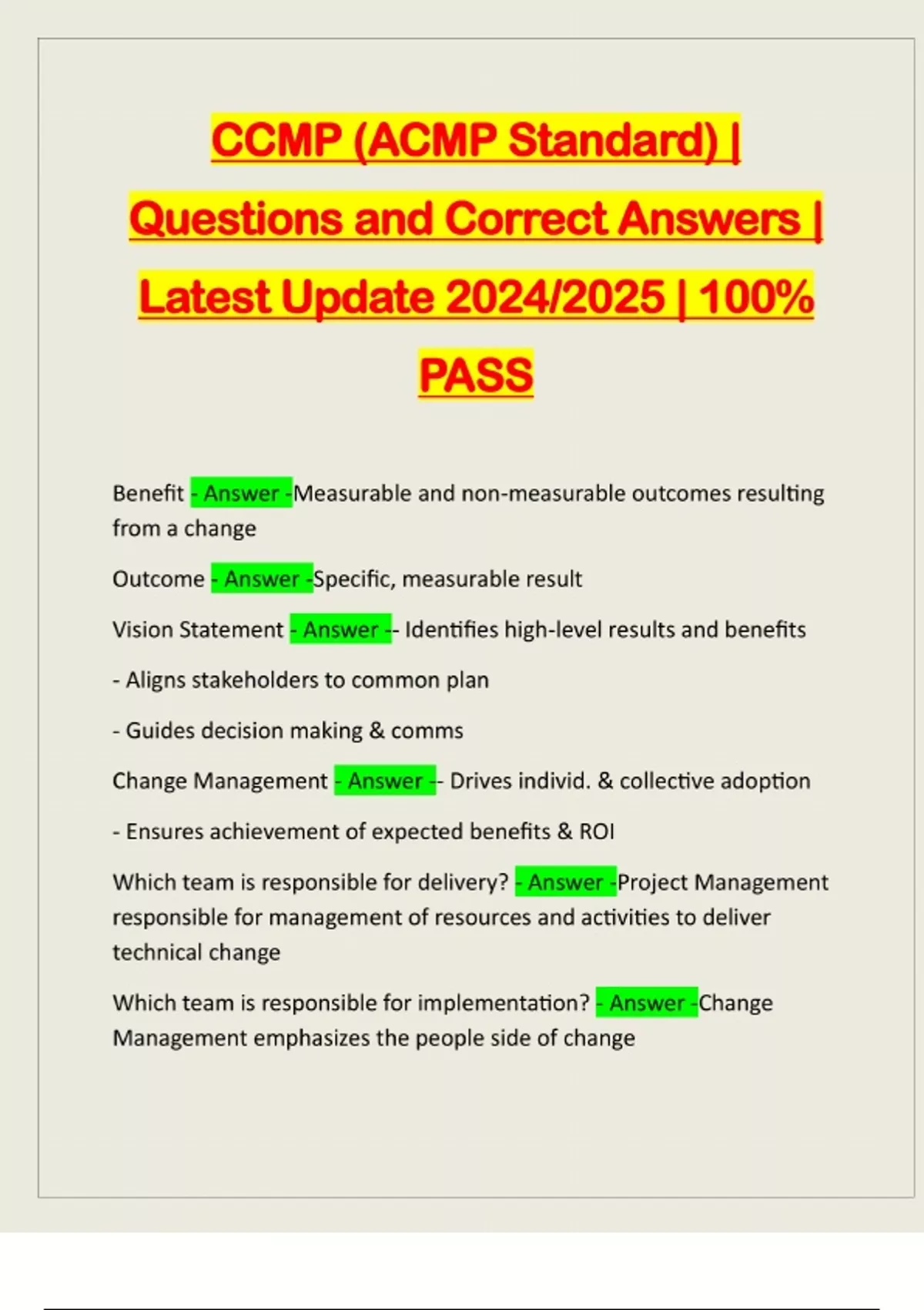 CCMP (ACMP Standard) | Questions and Correct Answers | Latest Update 2024/2025 | 100% PASS Benefit - Answer -Measurable and non-measurable outcomes resulting from a change Outcome - Answer -Specific, measurable result Vision Statement - Answer -- Identifies high-level results and benefits - Aligns stakeholders to common plan - Guides decision making & comms Change Management - Answer -- Drives individ. & collective adoption - Ensures achievement of expected benefits & ROI Which team is responsible for delivery?