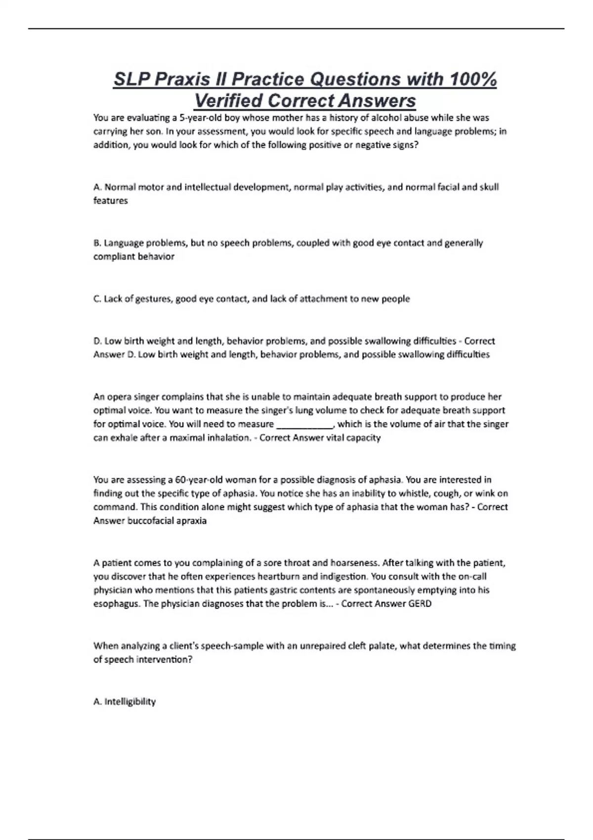 SLP Praxis II Practice Questions with 100% Verified Correct Answers You are evaluating a 5-year-old boy whose mother has a history of alcohol abuse while she was carrying her son. In your assessment, you would look for specific speech and language problems; in addition, you would look for which of the following positive or negative signs? A. Normal motor and intellectual development, normal play activities, and normal facial and skull features B. Language problems, but no speech problems, coupled with good eye contact and generally compliant behavior C. Lack of gestures, good eye contact, and lack of attachment to new people D. Low birth weight and length, behavior problems, and possible swallowing difficulties - Correct Answer D. Low birth weight and length, behavior problems, and possible swallowing difficulties An opera singer complains that she is unable to maintain adequate breath support to produce her optimal voice. You want to measure the singer's lung volume to check for adequate breath support for optimal voice. You will need to measure ___________, which is the volume of air that the singer can exhale after a maximal inhalation. - Correct Answer vital capacity You are assessing a 60-year-old woman for a possible diagnosis of aphasia. You are interested in finding out the specific type of aphasia. You notice she has an inability to whistle, cough, or wink on command. This condition alone might suggest which type of aphasia that the woman has? - Correct Answer buccofacial apraxia A patient comes to you complaining of a sore throat and hoarseness. After talking with the patient, you discover that he often experiences heartburn and indigestion. You consult with the on-call physician who mentions that this patients gastric contents are spontaneously emptying into his esophagus. The physician diagnoses that the problem is... - Correct Answer GERD When analyzing a client's speech-sample with an unrepaired cleft palate, what determines the timing of speech intervention? A. Intelligibility