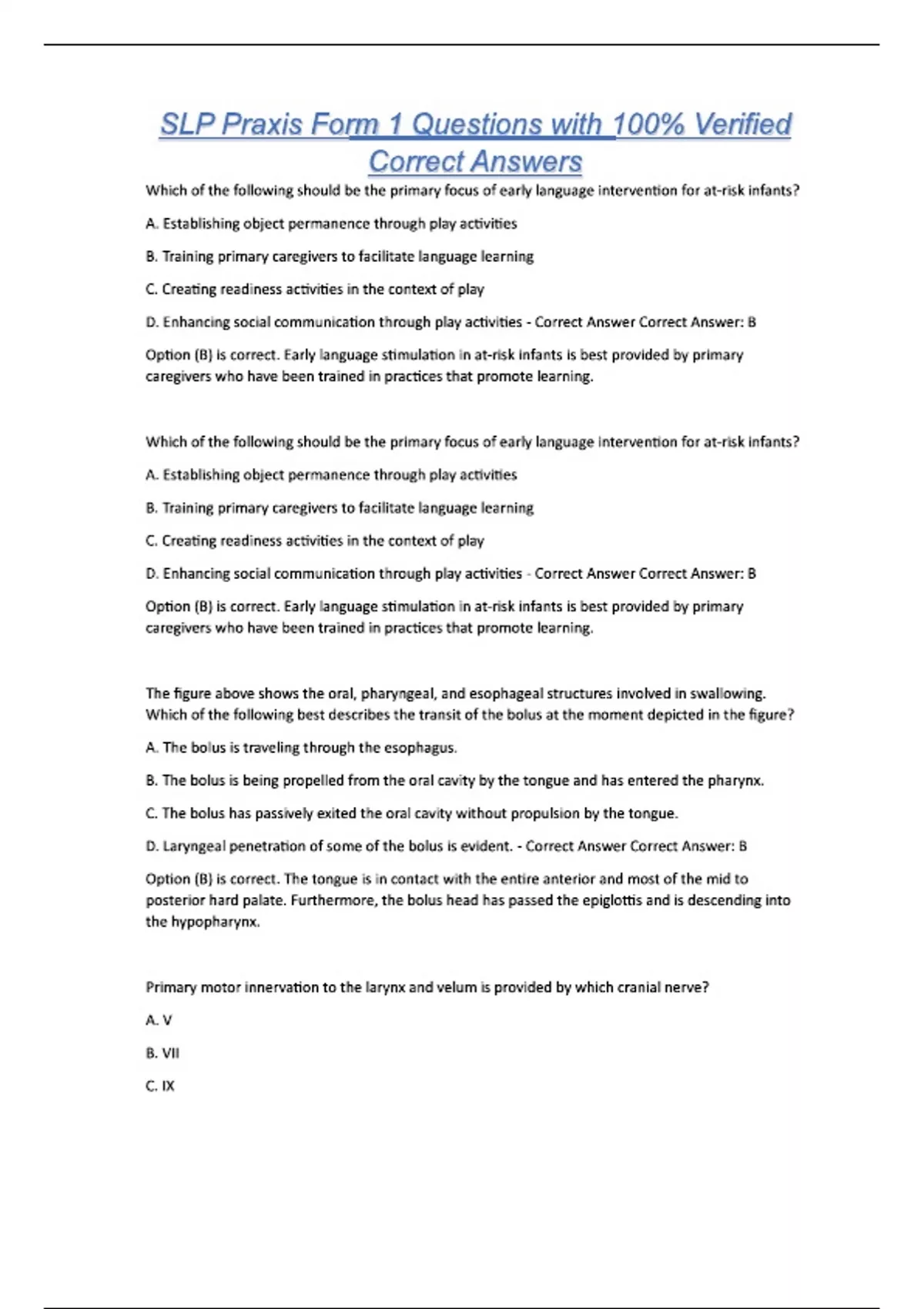 SLP Praxis Form 1 Questions with 100% Verified Correct Answers Which of the following should be the primary focus of early language intervention for at-risk infants? A. Establishing object permanence through play activities B. Training primary caregivers to facilitate language learning C. Creating readiness activities in the context of play D. Enhancing social communication through play activities - Correct Answer Correct Answer: B Option (B) is correct. Early language stimulation in at-risk infants is best provided by primary caregivers who have been trained in practices that promote learning. Which of the following should be the primary focus of early language intervention for at-risk infants? A. Establishing object permanence through play activities B. Training primary caregivers to facilitate language learning C. Creating readiness activities in the context of play D. Enhancing social communication through play activities - Correct Answer Correct Answer: B Option (B) is correct. Early language stimulation in at-risk infants is best provided by primary caregivers who have been trained in practices that promote learning. The figure above shows the oral, pharyngeal, and esophageal structures involved in swallowing. Which of the following best describes the transit of the bolus at the moment depicted in the figure? A. The bolus is traveling through the esophagus. B. The bolus is being propelled from the oral cavity by the tongue and has entered the pharynx. C. The bolus has passively exited the oral cavity without propulsion by the tongue. D. Laryngeal penetration of some of the bolus is evident. - Correct Answer Correct Answer: B Option (B) is correct. The tongue is in contact with the entire anterior and most of the mid to posterior hard palate. Furthermore, the bolus head has passed the epiglottis and is descending into the hypopharynx. Primary motor innervation to the larynx and velum is provided by which cranial nerve? A. V B. VII C. IX