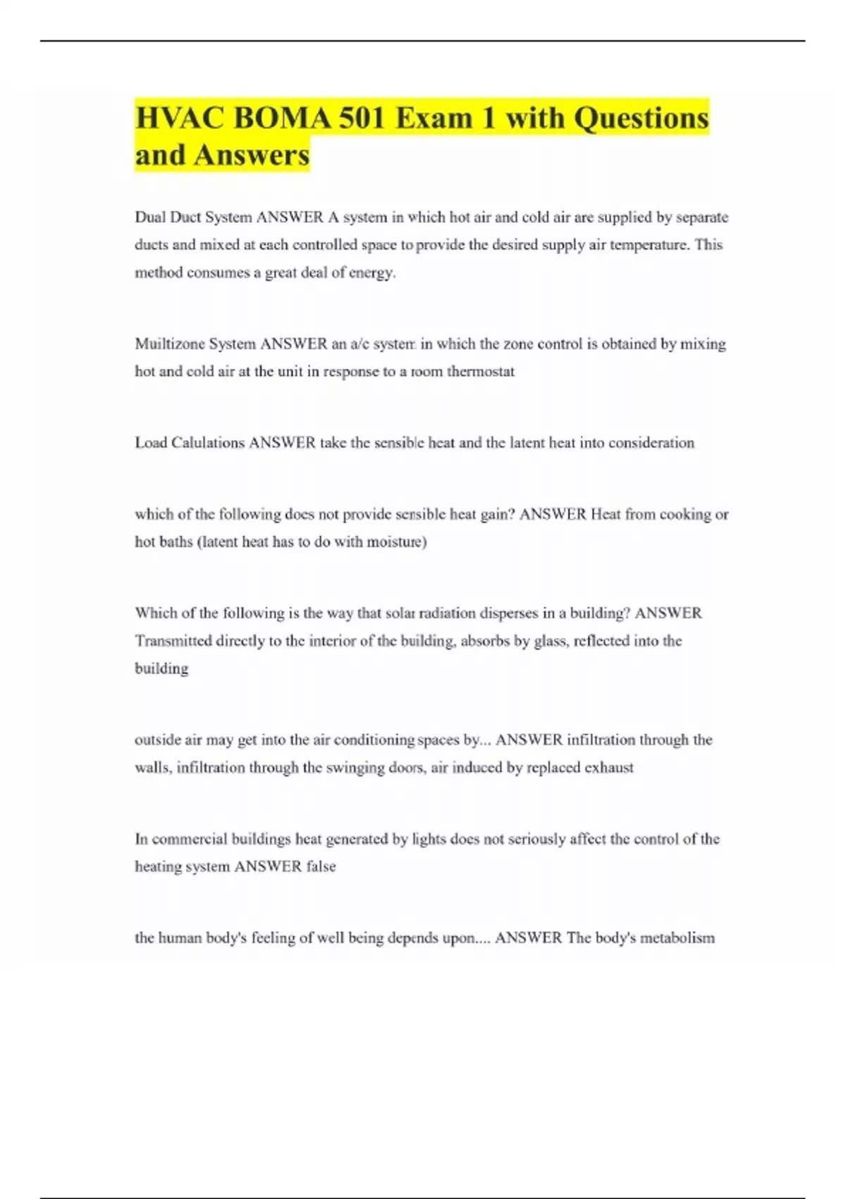 HVAC BOMA 501 Exam 1 with Questions and Answers Dual Duct System ANSWER A system in which hot air and cold air are supplied by separate ducts and mixed at each controlled space to provide the desired supply air temperature. This method consumes a great deal of energy. Muiltizone System ANSWER an a/c system in which the zone control is obtained by mixing hot and cold air at the unit in response to a room thermostat Load Calulations ANSWER take the sensible heat and the latent heat into consideration which of the following does not provide sensible heat gain? ANSWER Heat from cooking or hot baths (latent heat has to do with moisture) Which of the following is the way that solar radiation disperses in a building? ANSWER Transmitted directly to the interior of the building, absorbs by glass, reflected into the building outside air may get into the air conditioning spaces by... ANSWER infiltration through the walls, infiltration through the swinging doors, air induced by replaced exhaust In commercial buildings heat generated by lights does not seriously affect the control of the heating system ANSWER false the human body's feeling of well being depends upon.... ANSWER The body's metabolism
