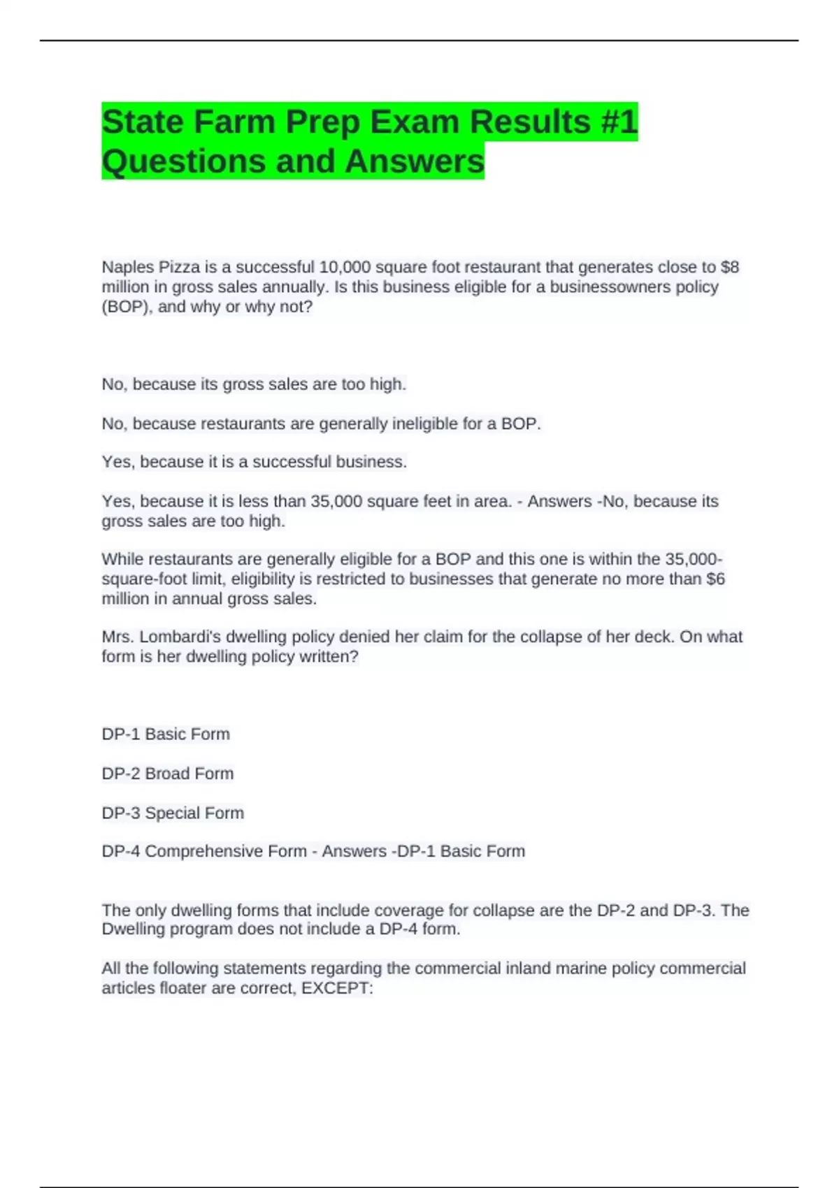 State Farm Prep Exam Results #1 Questions and Answers