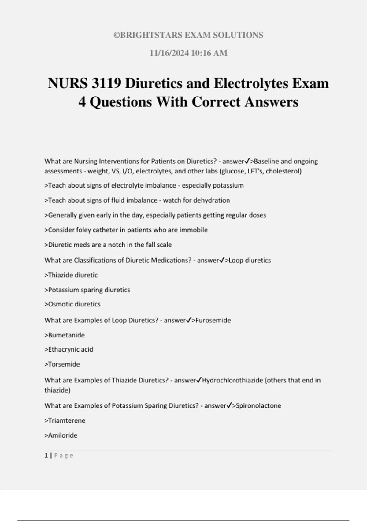 ©BRIGHTSTARS EXAM SOLUTIONS 11/16/2024 10:16 AM 1 | P a g e NURS 3119 Diuretics and Electrolytes Exam 4 Questions With Correct Answers What are Nursing Interventions for Patients on Diuretics? - answer>Baseline and ongoing assessments - weight, VS, I/O, electrolytes, and other labs (glucose, LFT's, cholesterol) >Teach about signs of electrolyte imbalance - especially potassium >Teach about signs of fluid imbalance - watch for dehydration >Generally given early in the day, especially patients getting regular doses >Consider foley catheter in patients who are immobile >Diuretic meds are a notch in the fall scale What are Classifications of Diuretic Medications? - answer>Loop diuretics >Thiazide diuretic >Potassium sparing diuretics >Osmotic diuretics What are Examples of Loop Diuretics? - answer>Furosemide >Bumetanide >Ethacrynic acid >Torsemide What are Examples of Thiazide Diuretics? - answerHydrochlorothiazide (others that end in thiazide) What are Examples of Potassium Sparing Diuretics? - answer>Spironolactone >Triamterene >Amiloride