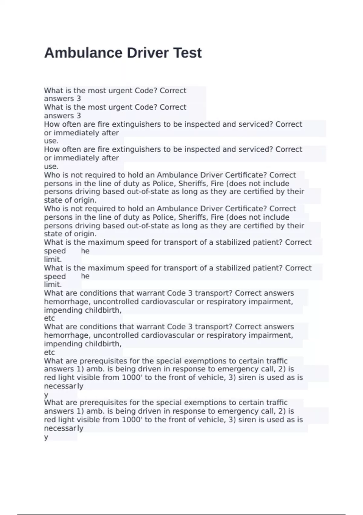 What is the most urgent Code? Correct answers 3 What is the most urgent Code? Correct answers 3 How often are fire extinguishers to be inspected and serviced? Correct answers Yearly, or immediately after use. How often are fire extinguishers to be inspected and serviced? Correct answers Yearly, or immediately after use. Who is not required to hold an Ambulance Driver Certificate? Correct answers 1) persons in the line of duty as Police, Sheriffs, Fire (does not include voulnteers) 2) persons driving based out-of-state as long as they are certified by their state of origin. Who is not required to hold an Ambulance Driver Certificate? Correct answers 1) persons in the line of duty as Police, Sheriffs, Fire (does not include voulnteers) 2) persons driving based out-of-state as long as they are certified by their state of origin. What is the maximum speed for transport of a stabilized patient? Correct answers The speed limit. What is the maximum speed for transport of a stabilized patient? Correct answers The speed limit. What are conditions that warrant Code 3 transport? Correct answers Uncontrolled hemorrhage, uncontrolled cardiovascular or respiratory impairment, complicated impending childbirth, etc What are conditions that warrant Code 3 transport? Correct answers Uncontrolled hemorrhage, uncontrolled cardiovascular or respiratory impairment, complicated impending childbirth, etc What are prerequisites for the special exemptions to certain traffic laws? Correct answers 1) amb. is being driven in response to emergency call, 2) is displaying a steady red light visible from 1000' to the front of vehicle, 3) siren is used as is reasonably necessary What are prerequisites for the special exemptions to certain traffic laws? Correct answers 1) amb. is being driven in response to emergency call, 2) is displaying a steady red light visible from 1000' to the front of vehicle, 3) siren is used as is reasonably necessary