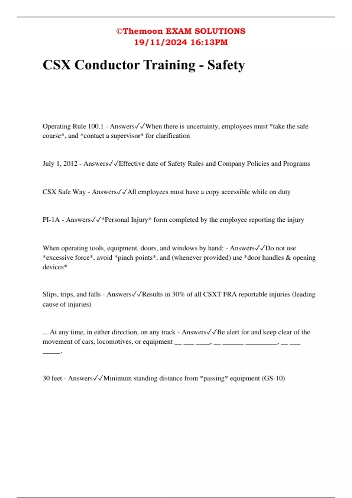 CSX Safe Way - Answers✓✓All employees must have a copy accessible while on duty