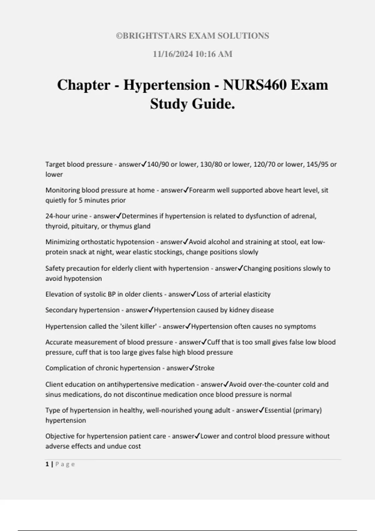 ©BRIGHTSTARS EXAM SOLUTIONS 11/16/2024 10:16 AM 1 | P a g e Chapter - Hypertension - NURS460 Exam Study Guide. Target blood pressure - answer140/90 or lower, 130/80 or lower, 120/70 or lower, 145/95 or lower Monitoring blood pressure at home - answerForearm well supported above heart level, sit quietly for 5 minutes prior 24-hour urine - answerDetermines if hypertension is related to dysfunction of adrenal, thyroid, pituitary, or thymus gland Minimizing orthostatic hypotension - answerAvoid alcohol and straining at stool, eat low- protein snack at night, wear elastic stockings, change positions slowly Safety precaution for elderly client with hypertension - answerChanging positions slowly to avoid hypotension Elevation of systolic BP in older clients - answerLoss of arterial elasticity Secondary hypertension - answerHypertension caused by kidney disease Hypertension called the 'silent killer' - answerHypertension often causes no symptoms Accurate measurement of blood pressure - answerCuff that is too small gives false low blood pressure, cuff that is too large gives false high blood pressure Complication of chronic hypertension - answerStroke Client education on antihypertensive medication - answerAvoid over-the-counter cold and sinus medications, do not discontinue medication once blood pressure is normal Type of hypertension in healthy, well-nourished young adult - answerEssential (primary) hypertension Objective for hypertension patient care - answerLower and control blood pressure without adverse effects and undue cost
