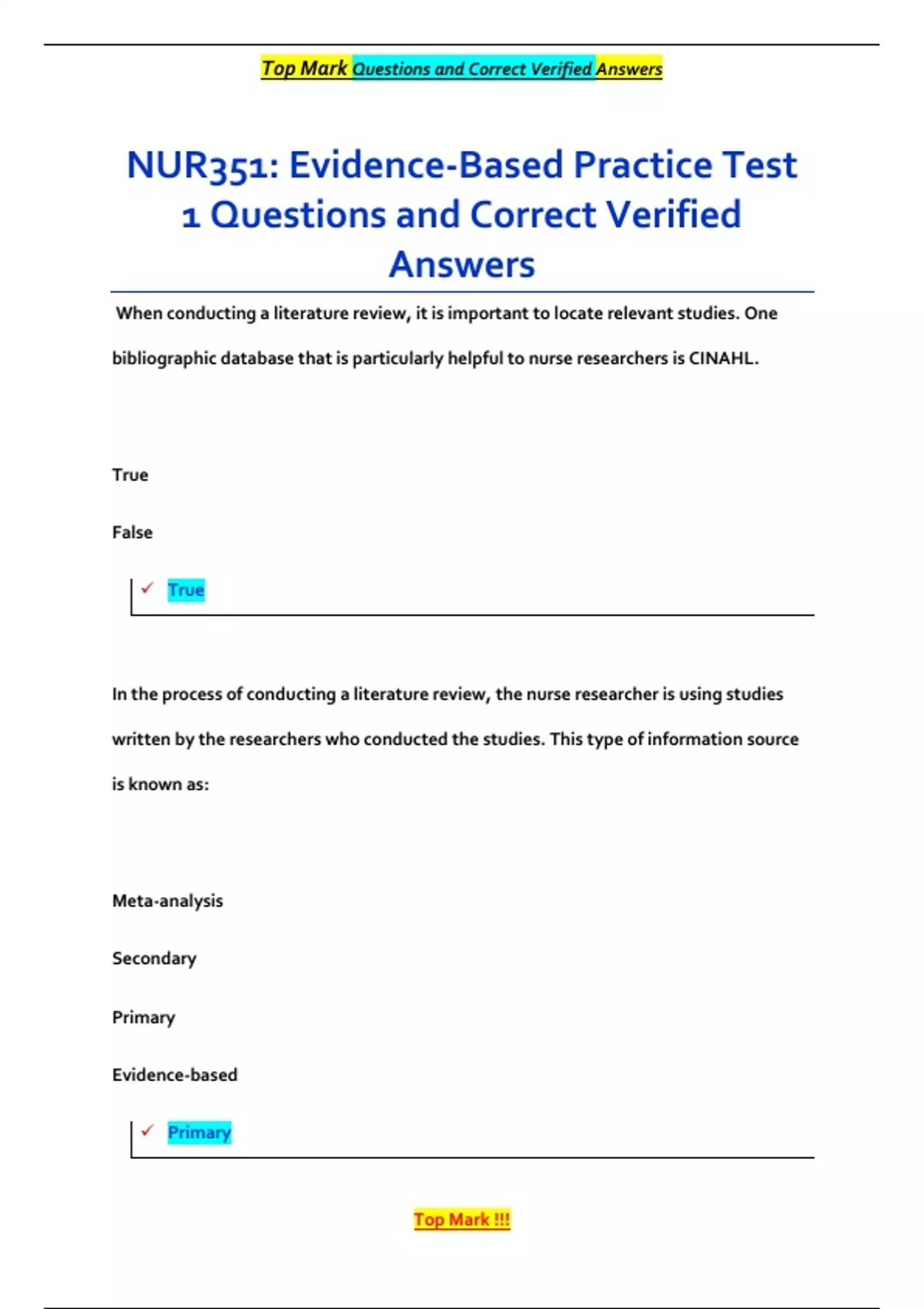 When conducting a literature review, it is important to locate relevant studies. One bibliographic database that is particularly helpful to nurse researchers is CINAHL. True False True In the process of conducting a literature review, the nurse researcher is using studies written by the researchers who conducted the studies. This type of information source is known as: Meta-analysis Secondary Primary Evidence-based Primary Top Mark Questions and Correct Verified Answers Top Mark !!! The primary purpose of the research literature review is: (Select all that apply.) A. Develop recommendations for future research B. Suggest appropriate research methods C. Assist in developing the research question D. Collect data about the target population E. Construct a conceptual framework B, C, E --- Rationale: Literature reviews lay the foundation for new research studies. During the process of conducting a literature review, information from peer-reviewed sources serve to inform the researcher about appropriate methods, conceptual frameworks, and research questions. Which type of evidence based on the evidence hierarchy is considered to be the strongest? Systematic rev
