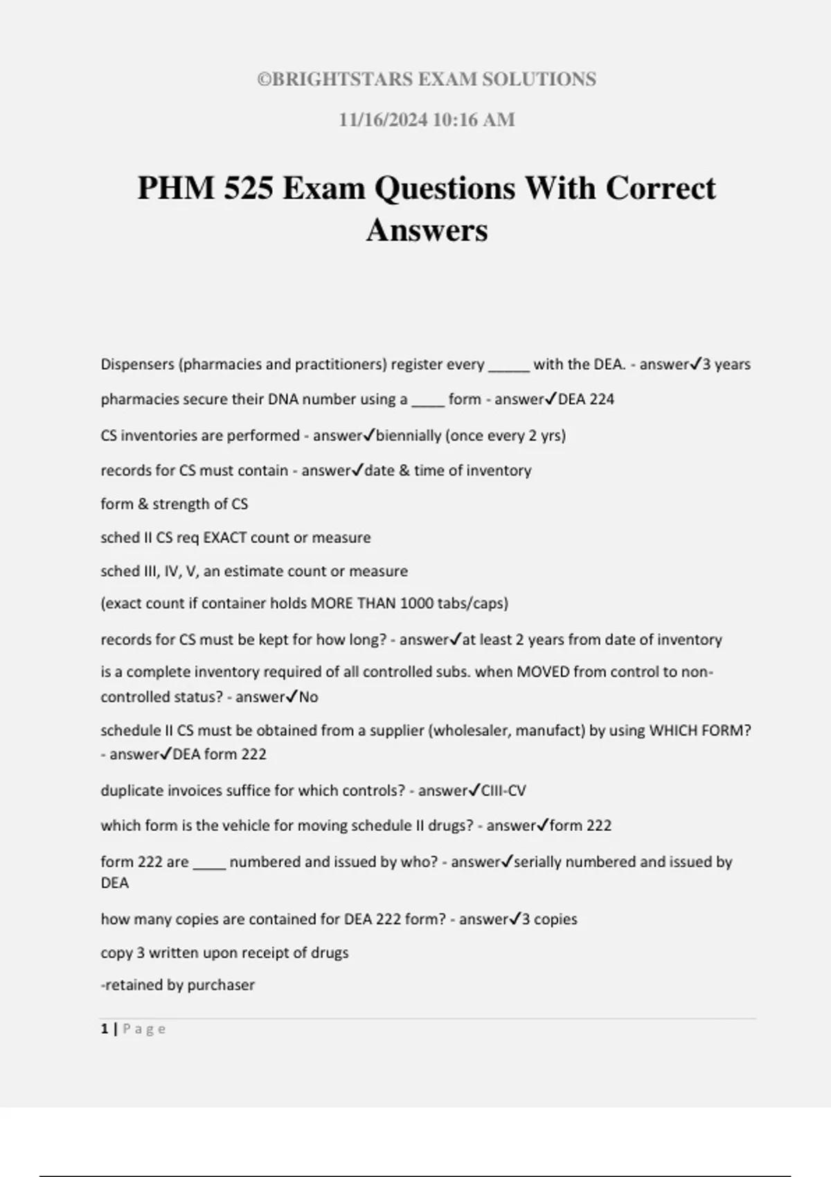 ©BRIGHTSTARS EXAM SOLUTIONS 11/16/2024 10:16 AM 1 | P a g e PHM 525 Exam Questions With Correct Answers Dispensers (pharmacies and practitioners) register every _____ with the DEA. - answer3 years pharmacies secure their DNA number using a ____ form - answerDEA 224 CS inventories are performed - answerbiennially (once every 2 yrs) records for CS must contain - answerdate & time of inventory form & strength of CS sched II CS req EXACT count or measure sched III, IV, V, an estimate count or measure (exact count if container holds MORE THAN 1000 tabs/caps) records for CS must be kept for how long? - answerat least 2 years from date of inventory is a complete inventory required of all controlled subs. when MOVED from control to non- controlled status? - answerNo schedule II CS must be obtained from a supplier (wholesaler, manufact) by using WHICH FORM? - answerDEA form 222 duplicate invoices suffice for which controls? - answerCIII-CV which form is the vehicle for moving schedule II drugs? - answerform 222 form 222 are ____ numbered and issued by who? - answerserially numbered and issued by DEA how many copies are contained for DEA 222 form? - answer3 copies copy 3 written upon receipt of drugs -retained by purchaser ©BRIGHTSTARS EXAM SOLUTIONS 11/16/2024 10:16 AM 2 | P a g e DEA 222 form is valid for not more than ____ days - answer60 upon receipt of schedule II CS by pharmacy, the pharmacy must record what? - answerthe NUMBER of commercial or bulk containers furnished on each item & DATE on which the containers are received 222 form must be maintained for how long? - answer2 years theft or loss of CS must be filed using what? - answerform 106 to DEA disposal of CS must be submitted using which form? - answerDEA form 41 transfer records of CS must be kept for at least ____ - answer2 years -record transaction must be delivered to agent of DEA or nearest DEA office methadone may be dispensed in hospitals if - answerit is not administered soley for detox purposes and used to maintain pts addiction (not to make comfortable) what strength tabs of methadone are only avail in hospitals? - answer40mg which strength of methadone are indicated for pain? - answer5 mg and 10 mg a CII fax Rx may serve as original if - answerthe narcotic rx calling for compounding of an: IV soln for direct administration to a pt in a private residence, long term care facility, or hospice setting prescriber MUST write on Rx that the pt is a hospice pt Schedule III & IV CS Rxs are valid for ____ from date of issuance - answer6 months Schedule II CS rx limit - answerhave no time limit but often recognized to be valid for up to 6 months location of stamp on CS filing - answerred ink in the lower right corner no less than 1 inch high CS II refill - answermay not be refilled CS III and IV may be refilled up to ___ times within ___ months from date of issue of RX - answerup to 5 times within 6 months ©BRIGHTSTARS