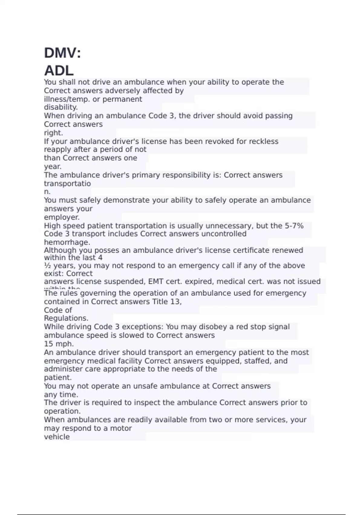 You shall not drive an ambulance when your ability to operate the vehicle safely is Correct answers adversely affected by fatigue, illness/temp. or permanent disability. When driving an ambulance Code 3, the driver should avoid passing vehicles on the Correct answers right. If your ambulance driver's license has been revoked for reckless driving, you may reapply after a period of not less than Correct answers one year. The ambulance driver's primary responsibility is: Correct answers safe patient transportation. You must safely demonstrate your ability to safely operate an ambulance to Correct answers your employer. High speed patient transportation is usually unnecessary, but the 5-7% that require Code 3 transport includes Correct answers uncontrolled hemorrhage. Although you posses an ambulance driver's license certificate renewed within the last 4 ½ years, you may not respond to an emergency call if any of the above exist: Correct answers license suspended, EMT cert. expired, medical cert. was not issued within the last two years. The rules governing the operation of an ambulance used for emergency services are contained in Correct answers Title 13, California Code of Regulations. While driving Code 3 exceptions: You may disobey a red stop signal only if the ambulance speed is slowed to Correct answers 15 mph. An ambulance driver should transport an emergency patient to the most accessible emergency medical facility Correct answers equipped, staffed, and prepared to administer care appropriate to the needs of the patient. You may not operate an unsafe ambulance at Correct answers any time. The driver is required to inspect the ambulance Correct answers prior to operation. When ambulances are readily available from two or more services, your ambulance may respond to a motor vehicle