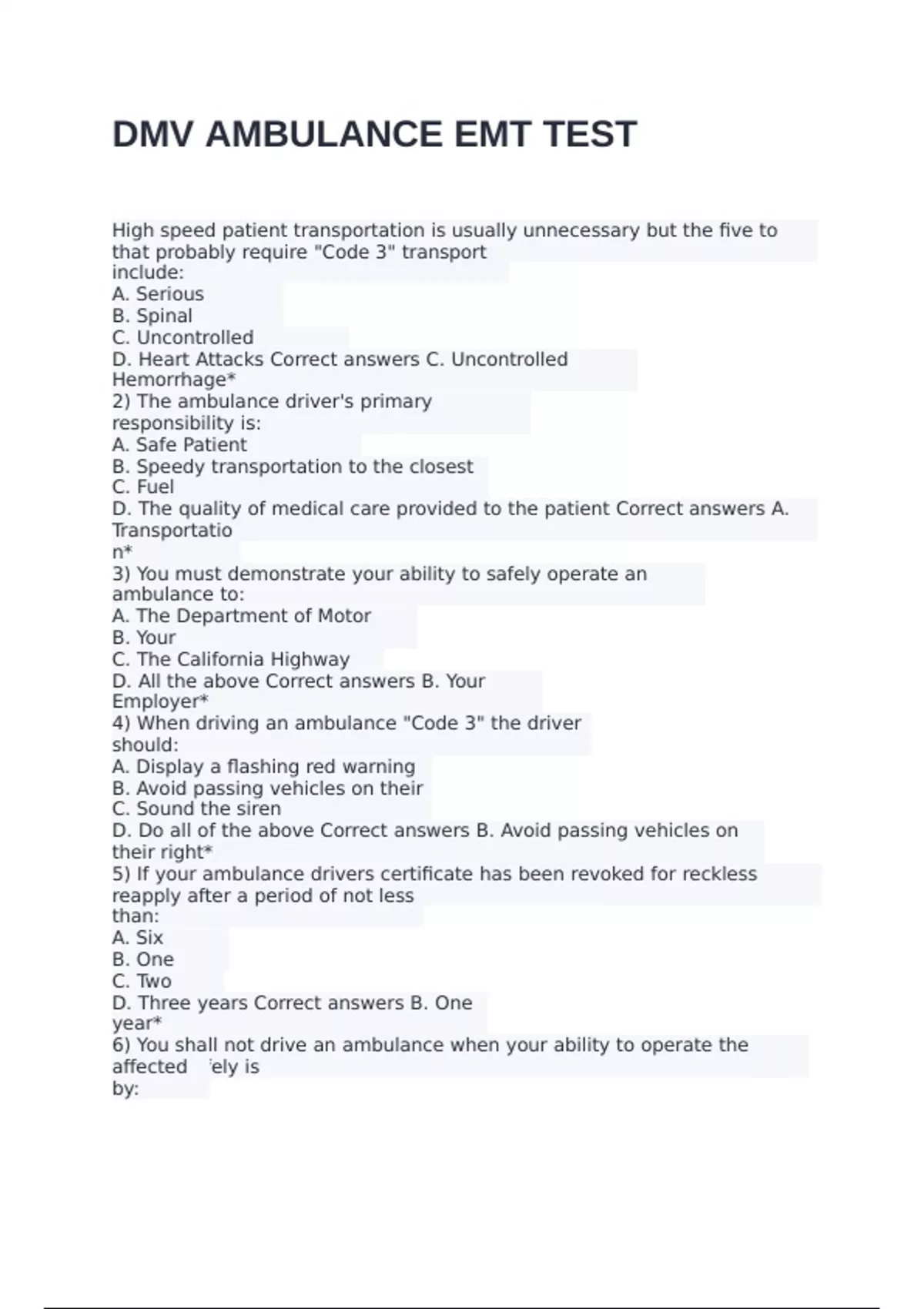 High speed patient transportation is usually unnecessary but the five to seven percent that probably require "Code 3" transport include: A. Serious Fractures B. Spinal Injuries C. Uncontrolled Hemorrhage D. Heart Attacks Correct answers C. Uncontrolled Hemorrhage* 2) The ambulance driver's primary responsibility is: A. Safe Patient Transportation B. Speedy transportation to the closest facility C. Fuel conservation D. The quality of medical care provided to the patient Correct answers A. Safe Patient Transportation* 3) You must demonstrate your ability to safely operate an ambulance to: A. The Department of Motor Vehicles B. Your Employer C. The California Highway Patrol D. All the above Correct answers B. Your Employer* 4) When driving an ambulance "Code 3" the driver should: A. Display a flashing red warning lamp B. Avoid passing vehicles on their right C. Sound the siren continuously D. Do all of the above Correct answers B. Avoid passing vehicles on their right* 5) If your ambulance drivers certificate has been revoked for reckless driving, you may reapply after a period of not less than: A. Six months B. One year C. Two years D. Three years Correct answers B. One year* 6) You shall not drive an ambulance when your ability to operate the vehicle safely is affected by: