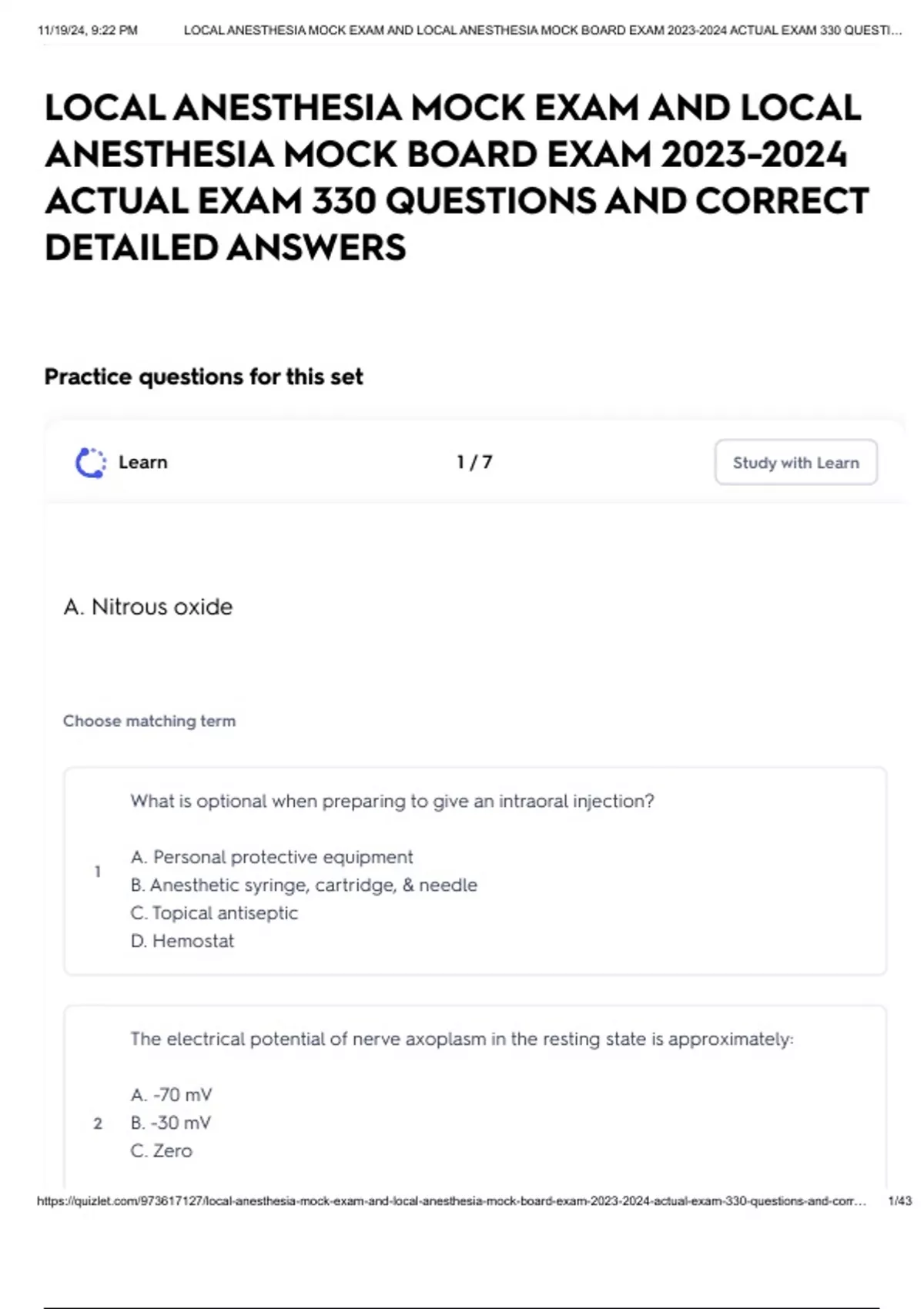 , 11/19/24, 9:22 PM LOCAL ANESTHESIA MOCK EXAM AND LOCAL ANESTHESIA MOCK BOARD EXAM 2023-2024 ACTUAL EXAM 330 QUESTI…