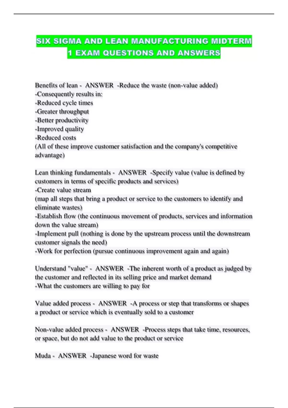 Lean thinking fundamentals - ANSWER -Specify value (value is defined by