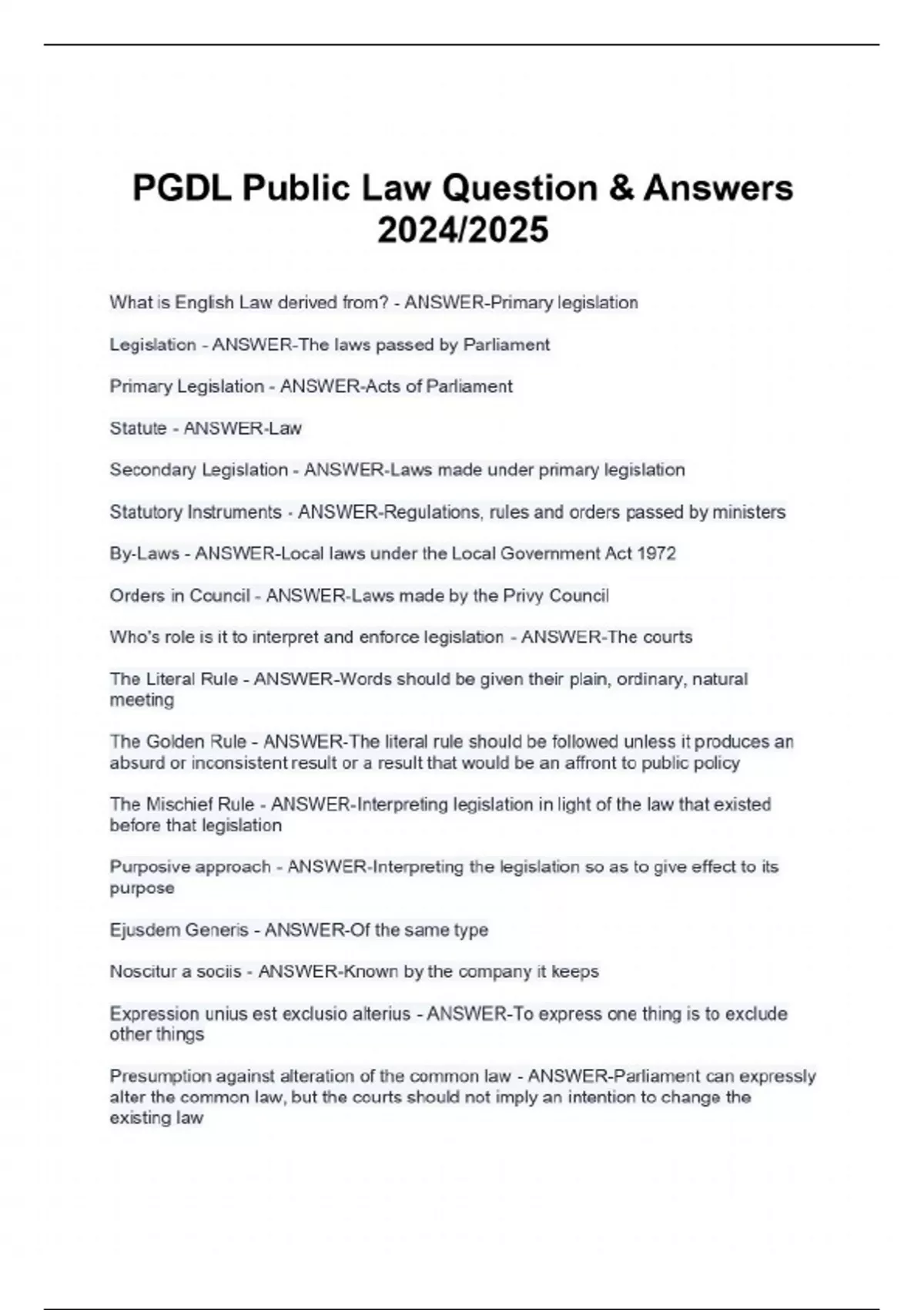 PGDL Public Law Question & Answers 2024/2025 What is English Law derived from? - ANSWER-Primary legislation Legislation - ANSWER-The laws passed by Parliament Primary Legislation - ANSWER-Acts of Parliament Statute - ANSWER-Law Secondary Legislation - ANSWER-Laws made under primary legislation Statutory Instruments - ANSWER-Regulations, rules and orders passed by ministers By-Laws - ANSWER-Local laws under the Local Government Act 1972 Orders in Council - ANSWER-Laws made by the Privy Council Who's role is it to interpret and enforce legislation - ANSWER-The courts The Literal Rule - ANSWER-Words should be given their plain, ordinary, natural meeting The Golden Rule - ANSWER-The literal rule should be followed unless it produces an absurd or inconsistent result or a result that would be an affront to public policy The Mischief Rule - ANSWER-Interpreting legislation in light of the law that existed before that legislation Purposive approach - ANSWER-Interpreting the legislation so as to give effect to its purpose Ejusdem Generis - ANSWER-Of the same type Noscitur a sociis - ANSWER-Known by the company it keeps Expression unius est exclusio alterius - ANSWER-To express one thing is to exclude other things Presumption against alteration of the common law - ANSWER-Parliament can expressly alter the common law, but the courts should not imply an intention to change the existing law Presumption against retrospective operation of statute - ANSWER-Parliament can expressly state that an Act comes into force on an earlier date, but if not, the courts should presume that statutes do not operate retrospectively Presumption against deprivation of liberty, property and private rights - ANSWER-Parliament is presumed not to intend to deprive anyone of their liberty or their property, not to deal with their personal property without compensation Presumption against ousting the jurisdiction of the courts - ANSWER-Parliament is presumed not to intend to oust the jurisdiction of the courts Ouster Clause - ANSWER-A clause included in a piece of legislation by a legislative body to exclude judicial review of acts and decisions of the executive Presumption against binding the Crown - ANSWER-Acts of parliament are presumed not to bind the monarch unless the Act expressly states as much Presumption against criminal liability without a Men’s Rea - ANSWER-Unless Parliament state expressly or it is implied by being termed an offence of 'strict liability' it will be presumed that parliament intended no liability for a criminal offence Intrinsic - ANSWER-Included in the legislation itself Extrinsic - ANSWER-External to the legislation The interpretation Act 1978 - ANSWER-Provides for commonly used words in legislation Ratio Decidendi - ANSWER-Decisive legal reasoning Obiter Dicta - ANSWER-Statements made by the judge which are not part of the ratio Court Hierarchy - ANSWER-Supreme Court, Court of Appeal. High Court, (Crown Court, County Court, Magistrates) Does the supreme court bind itself? - ANSWER-No Does the court of appeal bind itself? - ANSWER-Normally, with exception Does the high court bind itself? - ANSWER-Not for cases heard at first instance, normally binds itself for cases heard as appeals Precedent - ANSWER-An earlier event or action that is regarded as an example or guide to be considered in subsequent similar circumstances Precedent: Applied - ANSWER-Where the current court follows a precedent decision Precedent: overruled - ANSWER-Where the current court overturns a precedent decision Precedent: Reversed - ANSWER-Where the current court overturns a precedent decision in the same case Precedent: Distinguished - ANSWER-Where the current court does not overrule a precedent but does not apply it, on the grounds that the facts or law between the two cases are sufficiently distinct At first instance - ANSWER-Begin CONTINUES..
