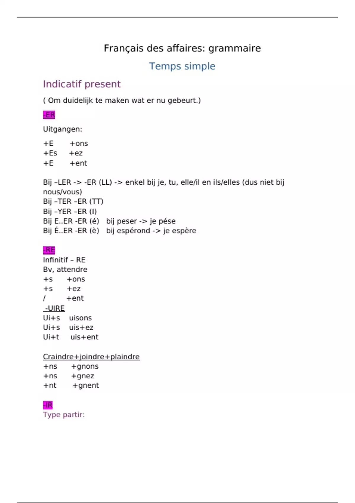 Ik heb Frans van begin moeten leren en om werkwoord grammatica te leren heb ik alle regels van werkwoordvervoegingen en uitzonderingen die gevraagd kunnen worden op het examen Français des affaires ( eerste jaar ) samen gevat in dit document. Door deze samenvatting te leren ben ik geslaagd voor werkwoord grammatica en uiteindelijk ook voor het examen! Good luck!