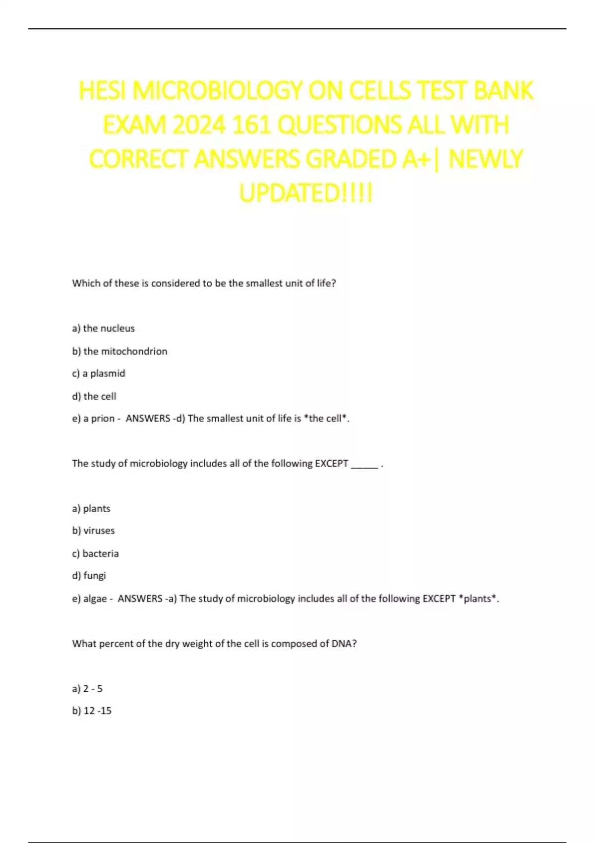 HESI MICROBIOLOGY ON CELLS TEST BANK EXAM 2024 161 QUESTIONS ALL WITH CORRECT ANSWERS GRADED A+| NEWLY UPDATED!!!! HESI MICROBIOLOGY ON CELLS TEST BANK EXAM 2024 161 QUESTIONS ALL WITH CORRECT ANSWERS GRADED A+| NEWLY UPDATED!!!! HESI MICROBIOLOGY ON CELLS TEST BANK EXAM 2024 161 QUESTIONS ALL WITH CORRECT ANSWERS GRADED A+| NEWLY UPDATED!!!! HESI MICROBIOLOGY ON CELLS TEST BANK EXAM 2024 161 QUESTIONS ALL WITH CORRECT ANSWERS GRADED A+| NEWLY UPDATED!!!! HESI MICROBIOLOGY ON CELLS TEST BANK EXAM 2024 161 QUESTIONS ALL WITH CORRECT ANSWERS GRADED A+| NEWLY UPDATED!!!! HESI MICROBIOLOGY ON CELLS TEST BANK EXAM 2024 161 QUESTIONS ALL WITH CORRECT ANSWERS GRADED A+| NEWLY UPDATED!!!! HESI MICROBIOLOGY ON CELLS TEST BANK EXAM 2024 161 QUESTIONS ALL WITH CORRECT ANSWERS GRADED A+| NEWLY UPDATED!!!! HESI MICROBIOLOGY ON CELLS TEST BANK EXAM 2024 161 QUESTIONS ALL WITH CORRECT ANSWERS GRADED A+| NEWLY UPDATED!!!! HESI MICROBIOLOGY ON CELLS TEST BANK EXAM 2024 161 QUESTIONS ALL WITH CORRECT ANSWERS GRADED A+| NEWLY UPDATED!!!!