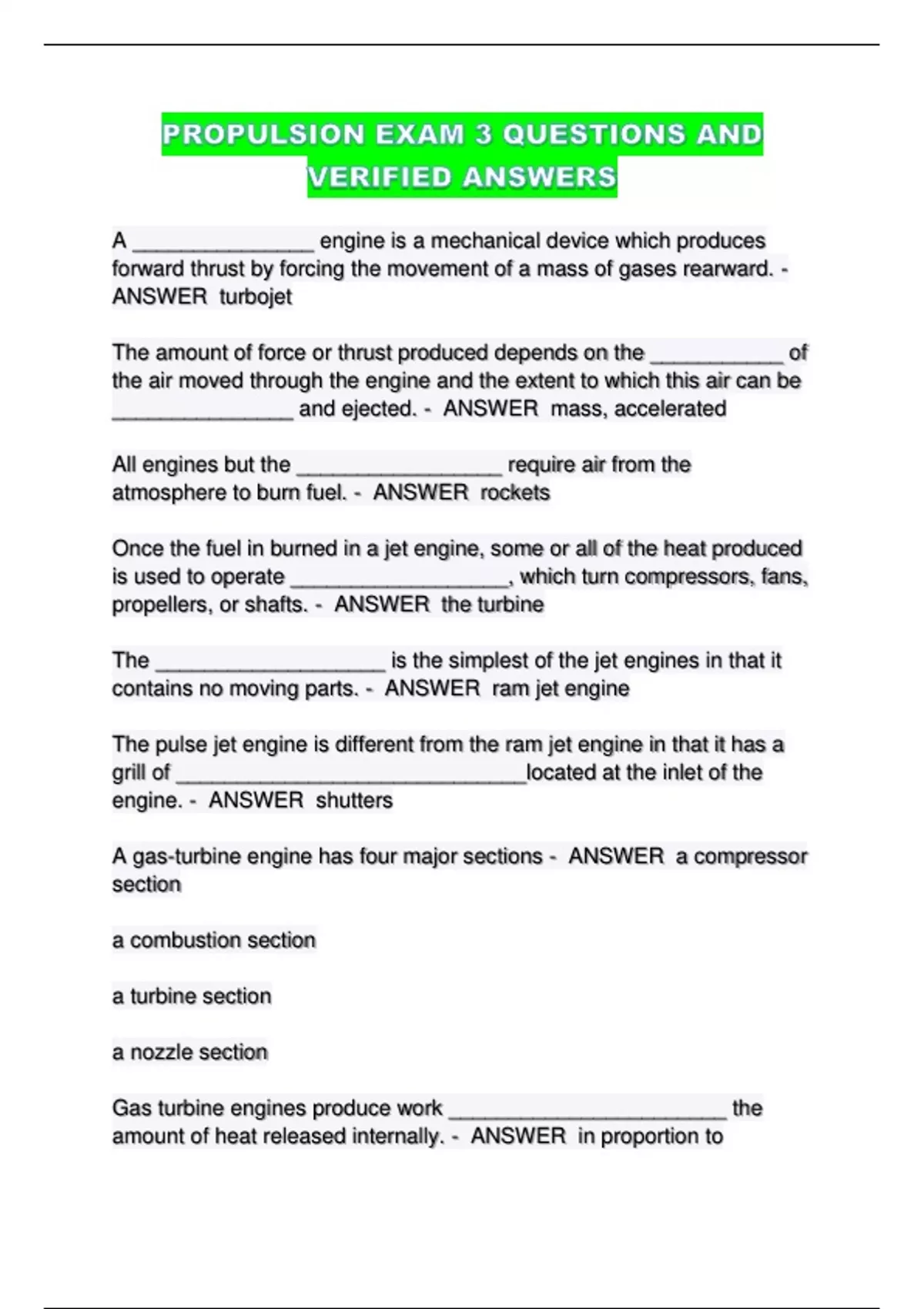 PROPULSION EXAM 3 QUESTIONS AND VERIFIED ANSWERS....