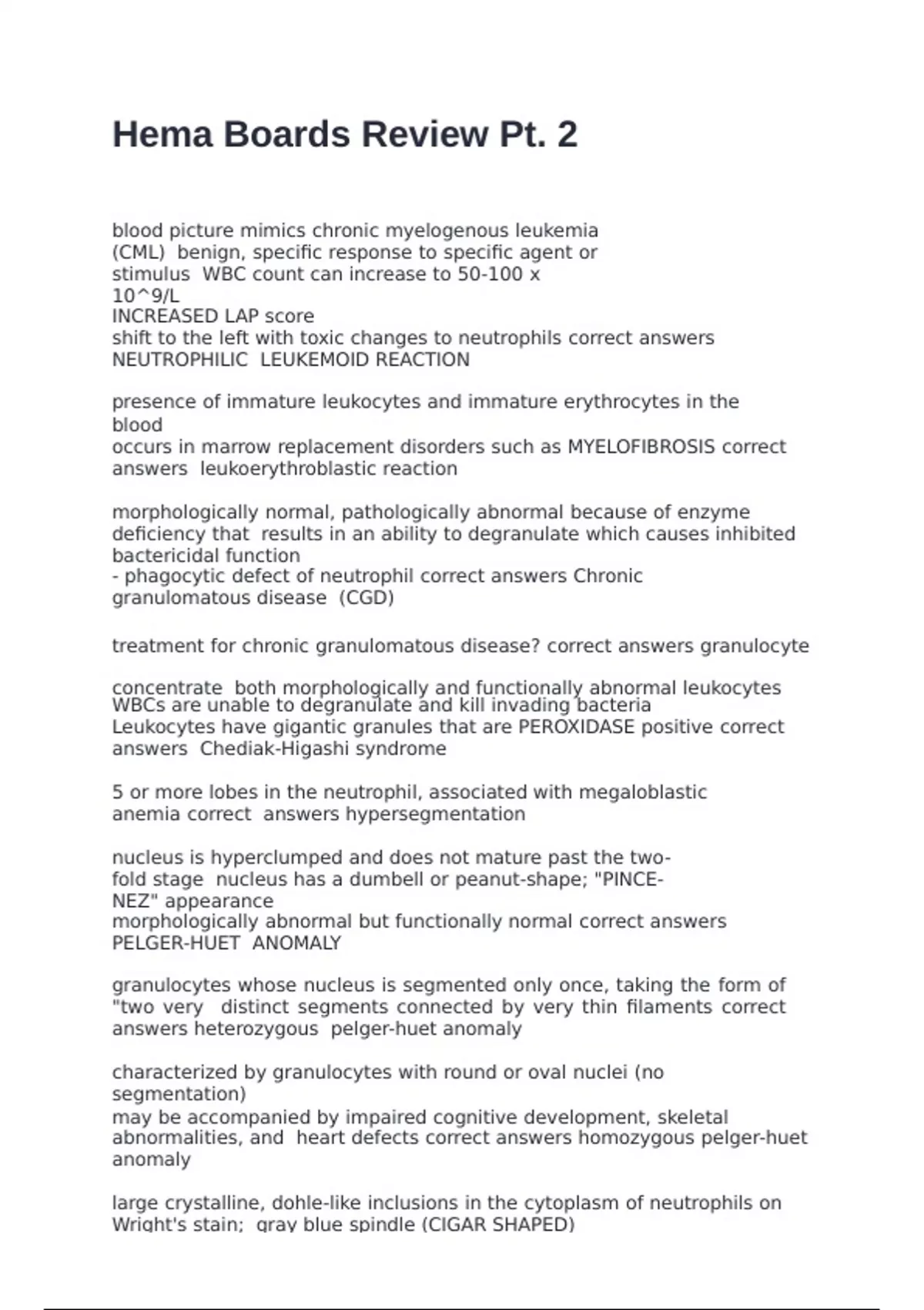 blood picture mimics chronic myelogenous leukemia (CML) benign, specific response to specific agent or stimulus WBC count can increase to 50-100 x 10^9/L INCREASED LAP score shift to the left with toxic changes to neutrophils correct answers NEUTROPHILIC LEUKEMOID REACTION presence of immature leukocytes and immature erythrocytes in the blood occurs in marrow replacement disorders such as MYELOFIBROSIS correct answers leukoerythroblastic reaction morphologically normal, pathologically abnormal because of enzyme deficiency that results in an ability to degranulate which causes inhibited bactericidal function - phagocytic defect of neutrophil correct answers Chronic granulomatous disease (CGD) treatment for chronic granulomatous disease? correct answers granulocyte concentrate both morphologically and functionally abnormal leukocytes WBCs are unable to degranulate and kill invading bacteria Leukocytes have gigantic granules that are PEROXIDASE positive correct answers Chediak-Higashi syndrome 5 or more lobes in the neutrophil, associated with megaloblastic anemia correct answers hypersegmentation nucleus is hyperclumped and does not mature past the two-fold stage nucleus has a dumbell or peanut-shape; "PINCE-NEZ" appearance morphologically abnormal but functionally normal correct answers PELGER-HUET ANOMALY granulocytes whose nucleus is segmented only once, taking the form of "two very distinct segments connected by very thin filaments correct answers heterozygous pelger-huet anomaly characterized by granulocytes with round or oval nuclei (no segmentation) may be accompanied by impaired cognitive development, skeletal abnormalities, and heart defects correct answers homozygous pelger-huet anomaly large crystalline, dohle-like inclusions in the cytoplasm of neutrophils on Wright's stain; gray blue spindle (CIGAR SHAPED)