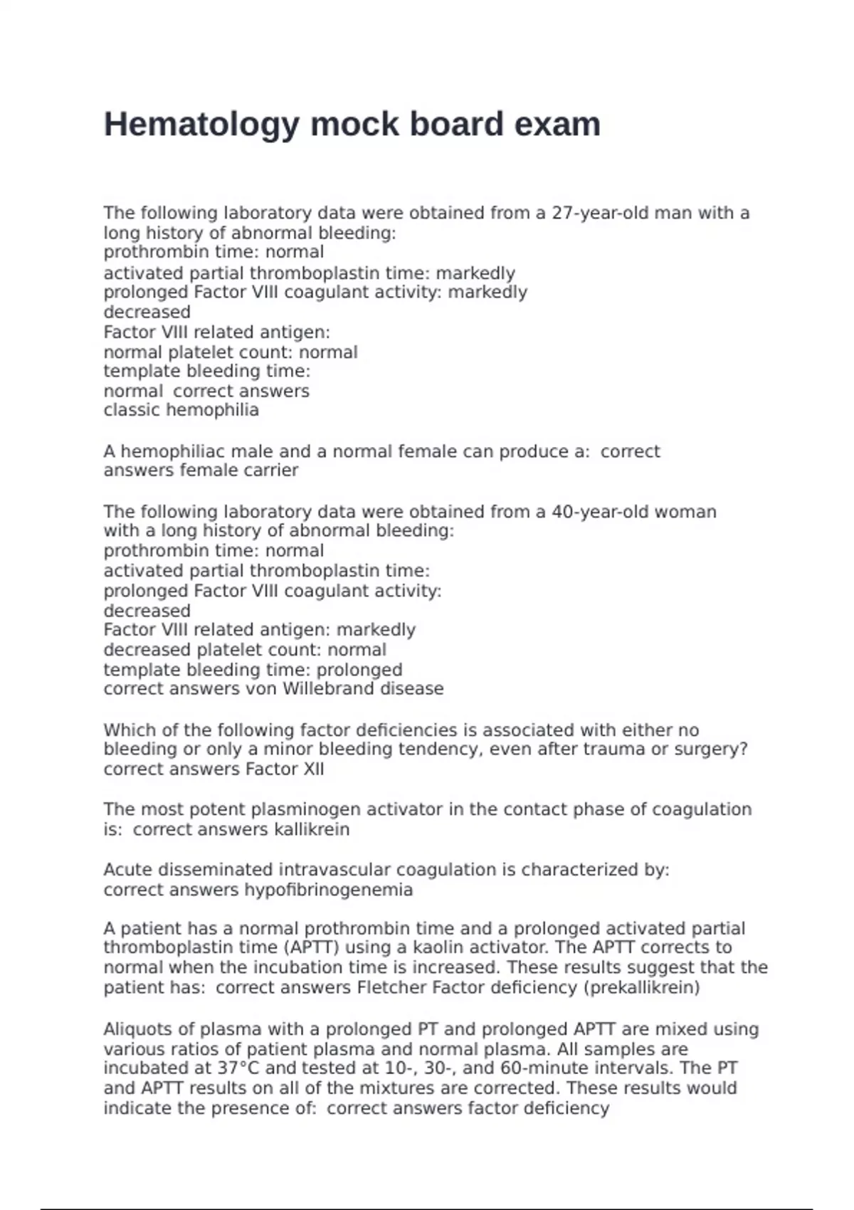 The following laboratory data were obtained from a 27-year-old man with a long history of abnormal bleeding: prothrombin time: normal activated partial thromboplastin time: markedly prolonged Factor VIII coagulant activity: markedly decreased Factor VIII related antigen: normal platelet count: normal template bleeding time: normal correct answers classic hemophilia A hemophiliac male and a normal female can produce a: correct answers female carrier The following laboratory data were obtained from a 40-year-old woman with a long history of abnormal bleeding: prothrombin time: normal activated partial thromboplastin time: prolonged Factor VIII coagulant activity: decreased Factor VIII related antigen: markedly decreased platelet count: normal template bleeding time: prolonged correct answers von Willebrand disease Which of the following factor deficiencies is associated with either no bleeding or only a minor bleeding tendency, even after trauma or surgery? correct answers Factor XII The most potent plasminogen activator in the contact phase of coagulation is: correct answers kallikrein Acute disseminated intravascular coagulation is characterized by: correct answers hypofibrinogenemia A patient has a normal prothrombin time and a prolonged activated partial thromboplastin time (APTT) using a kaolin activator. The APTT corrects to normal when the incubation time is increased. These results suggest that the patient has: correct answers Fletcher Factor deficiency (prekallikrein) Aliquots of plasma with a prolonged PT and prolonged APTT are mixed using various ratios of patient plasma and normal plasma. All samples are incubated at 37°C and tested at 10-, 30-, and 60-minute intervals. The PT and APTT results on all of the mixtures are corrected. These results would indicate the presence of: correct answers factor deficiency
