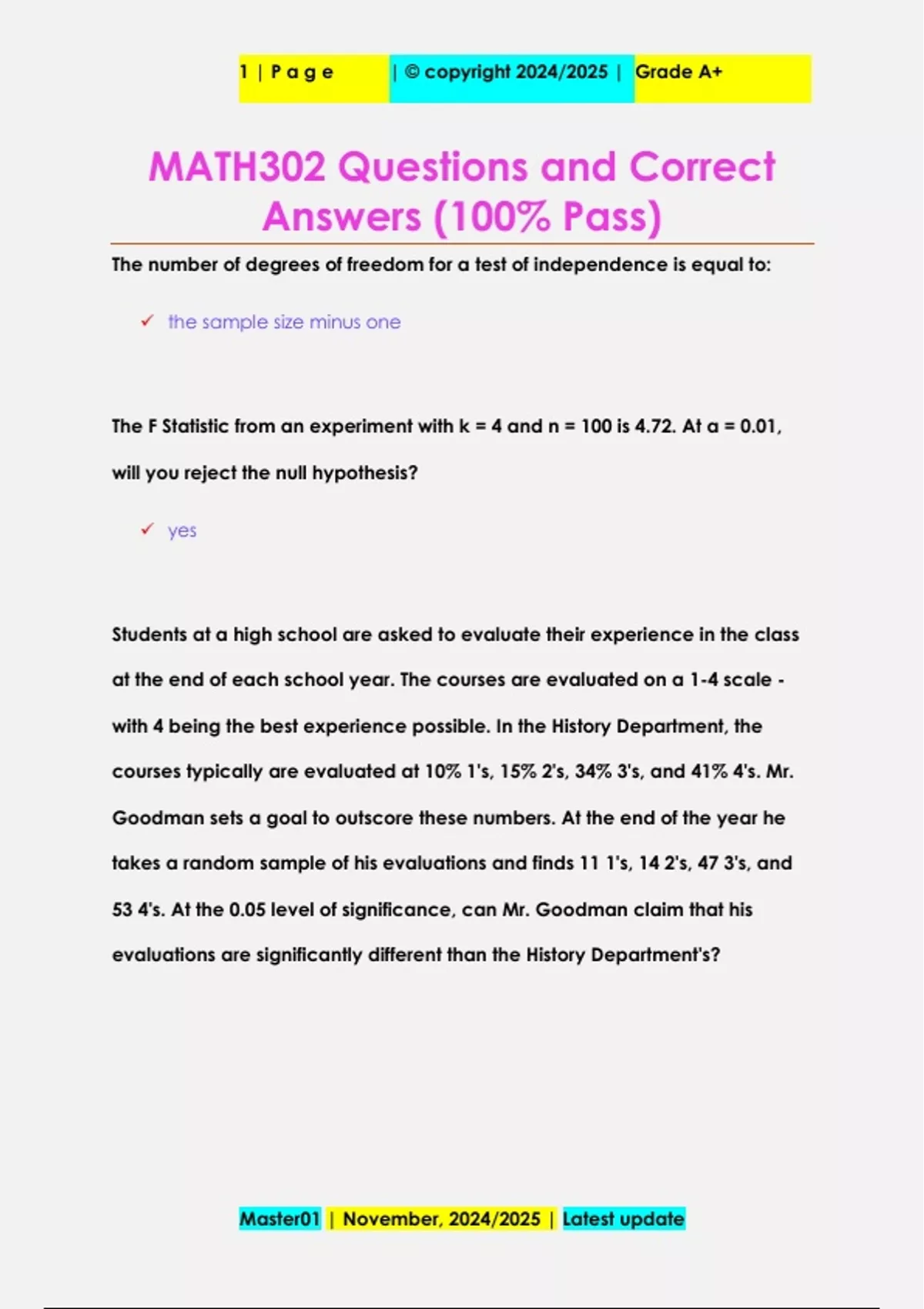 The number of degrees of freedom for a test of independence is equal to: the sample size minus one The F Statistic from an experiment with k = 4 and n = 100 is 4.72. At α = 0.01, will you reject the null hypothesis? yes Students at a high school are asked to evaluate their experience in the class at the end of each school year. The courses are evaluated on a 1-4 scale - with 4 being the best experience possible. In the History Department, the courses typically are evaluated at 10% 1's, 15% 2's, 34% 3's, and 41% 4's. Mr. Goodman sets a goal to outscore these numbers. At the end of the year he takes a random sample of his evaluations and finds 11 1's, 14 2's, 47 3's, and 53 4's. At the 0.05 level of significance, can Mr. Goodman claim that his evaluations are significantly different than the History Department's? Master01 | November, 2024/2025 | Latest update 1 | P a g e | © copyright 2024/2025 | Grade A+ Hypotheses: H0: There is no difference in Mr. Goodman's evaluations and the History Department's. H1: There is a difference in Mr. Goodman's evaluations and the History Department's. Enter the test statistic - round to 4 decimal places. 1.9196 Enter the p-value - round to 4 decimal places. 0.5893 Can it be concluded that there is a statistically significant difference in Mr. Goodman's evaluations and the History Department's? No