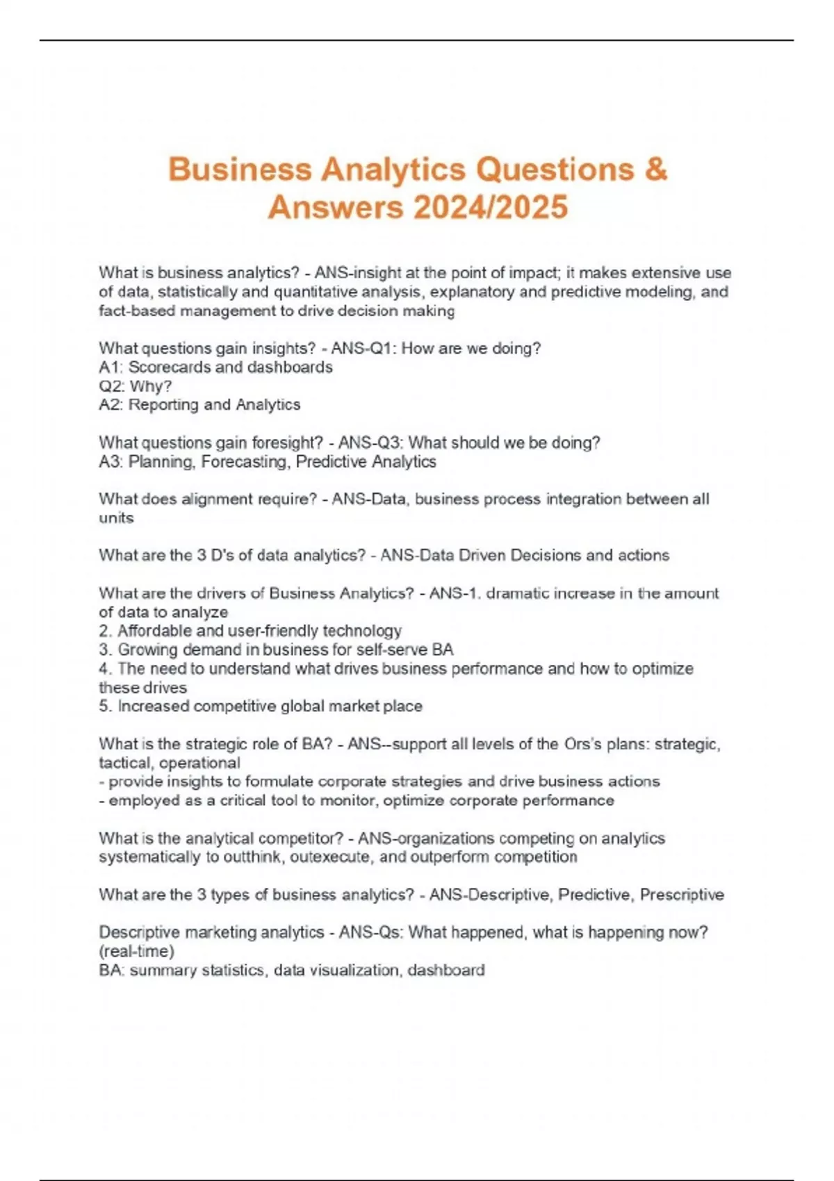 Business Analytics Questions & Answers 2024/2025 What is business analytics? - ANS-insight at the point of impact; it makes extensive use of data, statistically and quantitative analysis, explanatory and predictive modeling, and fact-based management to drive decision making What questions gain insights? - ANS-Q1: How are we doing? A1: Scorecards and dashboards Q2: Why? A2: Reporting and Analytics What questions gain foresight? - ANS-Q3: What should we be doing? A3: Planning, Forecasting, Predictive Analytics What does alignment require? - ANS-Data, business process integration between all units What are the 3 D's of data analytics? - ANS-Data Driven Decisions and actions What are the drivers of Business Analytics? - ANS-1. dramatic increase in the amount of data to analyze 2. Affordable and user-friendly technology 3. Growing demand in business for self-serve BA 4. The need to understand what drives business performance and how to optimize these drives 5. Increased competitive global market place What is the strategic role of BA? - ANS--support all levels of the Ors’s plans: strategic, tactical, operational - provide insights to formulate corporate strategies and drive business actions - employed as a critical tool to monitor, optimize corporate performance What is the analytical competitor? - ANS-organizations competing on analytics systematically to outthink, outexecute, and outperform competition What are the 3 types of business analytics? - ANS-Descriptive, Predictive, Prescriptive Descriptive marketing analytics - ANS-Qs: What happened, what is happening now? (real-time) BA: summary statistics, data visualization, dashboard Predictive marketing analytics - ANS-Qs: What could happen in the future, what trends? (future) BA: Forecasting, regression, predictive model, data mining Prescriptive marketing analytics - ANS-Qs: What is the best action, what should we prescribe? (action) BA: random testing, optimization modeling, simulation What are the 3 levels of BA? - ANS-Past, Present and Future What factors determine the past level of BA? - ANS-New Insight: How and why did it happen? (model) Known Information: What happened? (report) What factors determine the present level of BA? - ANS-New Insight: What's the best action? (recommended) Known Information: What is happening now? (report) What factors determine the future level of BA? - ANS-New Insight: What’s the best and worst that can happen? (predict, optimize, simulate) Known Information: What will happen? (extrapolate) BI vs BA - ANS-BI: measure, monitor against goals (it centric) BA: investigate, explore, discover (business centric) How do you measure the effectiveness of performance management? - ANS-strategy, tactics, operations how do you measure the efficiency of performance management? - ANS-Business process - value to resources What is the performance management process? - ANS-1. Define performance indicators 2. set performance goals 3. measure performance 4. analyze and perform measures 5. decide and act 6. monitor performance Performance Management - ANS-measure and monitor, analyze, decide and act based on past performance data DELTA analytical success factors - ANS-D- High quality data E- Enterprise orientation L- Analytical leadership T- Long-term strategic Target A- Team of Analysts Analytical Capability- Data - ANS-- the prerequisite for analytics - data must be clean, common, integrated and accessible in a central data warehouse - Competitive advantages to use measurements that are distinctive, proprietary and important Analytical Capability- Enterprise - ANS-Successful analytical competitors: - manage their data and analytics program at an enterprise level - create enterprise-wide analytical capabilities and invest in enterprise-scale analytical technologies Analytical Capability- Leadership - ANS-- leaders fully embracing analytics and leading a fact-based decision-making culture - the most critical trait of analytical co Analytical Capabilities- Targets - ANS-- start with a primary target for the initial analytical efforts - over time, the use analytical decision making will expand in an organization - long term success depends on the specific strategic applications Analytical Capability- Analyst - ANS-- key analytical resources: analysts and data -Analytical talent is needed at many levels What are the levels of analytical talent? - ANS-- champions (lead the talent) - Professionals -Semi-Professionals -Amateurs Stages in analytical maturity - ANS-Stage 1: analytically impaired Stage 2: Localized analytics Stage 3: Analytical inspirations Stage 4: Analytical companies Stage 5: Analytic competitors Why must Business and IT departments have a common goal? - ANS-to develop an effective database and analytics function to achieve organizational objectives Business vs IT - ANS-Business: consumers of analytics, decision makers. Want fast, self-serve BA, ad hoc BA IT: Data governance, security, reporting, and BI. Want scalability, build once use many times