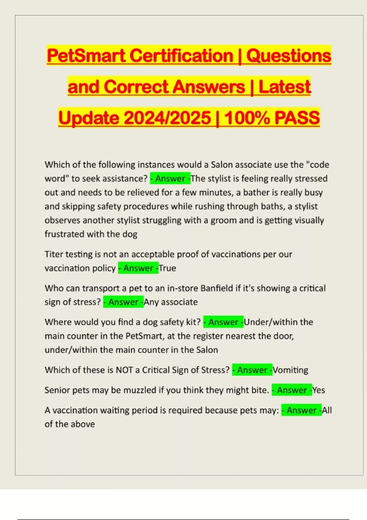 PetSmart Certification | Questions and Correct Answers | Latest Update 2024/2025 | 100% PASS