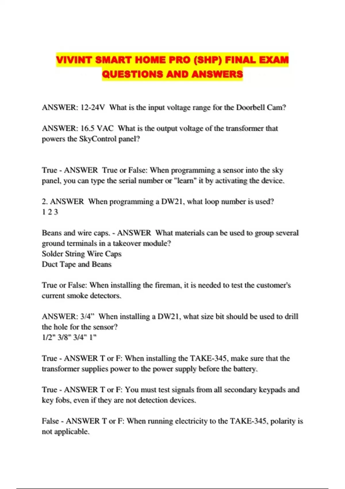 VIVINT SMART HOME PRO (SHP) FINAL EXAM