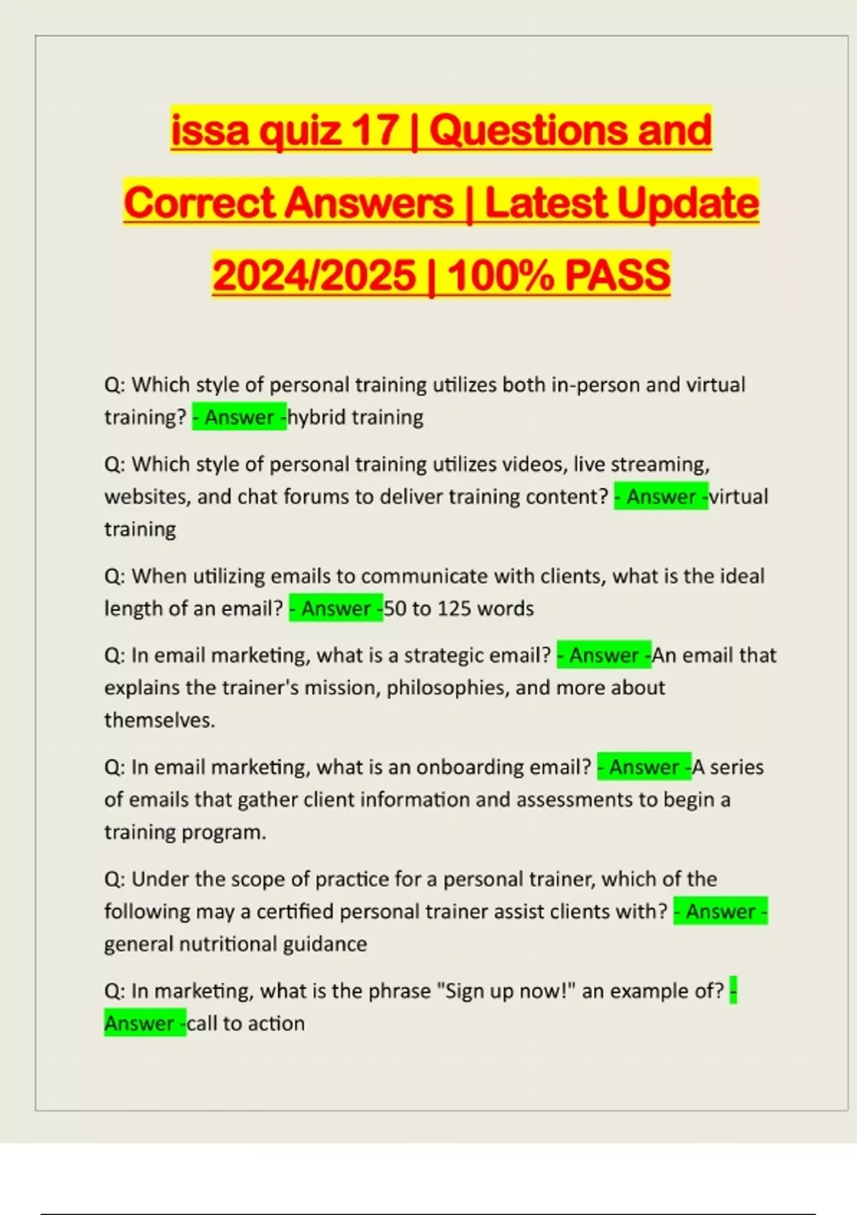 issa quiz 17 | Questions and Correct Answers | Latest Update 2024/2025 | 100% PASS Q: Which style of personal training utilizes both in-person and virtual training? - Answer -hybrid training Q: Which style of personal training utilizes videos, live streaming, websites, and chat forums to deliver training content? - Answer -virtual training Q: When utilizing emails to communicate with clients, what is the ideal length of an email? - Answer -50 to 125 words Q: In email marketing, what is a strategic email? - Answer -An email that explains the trainer's mission, philosophies, and